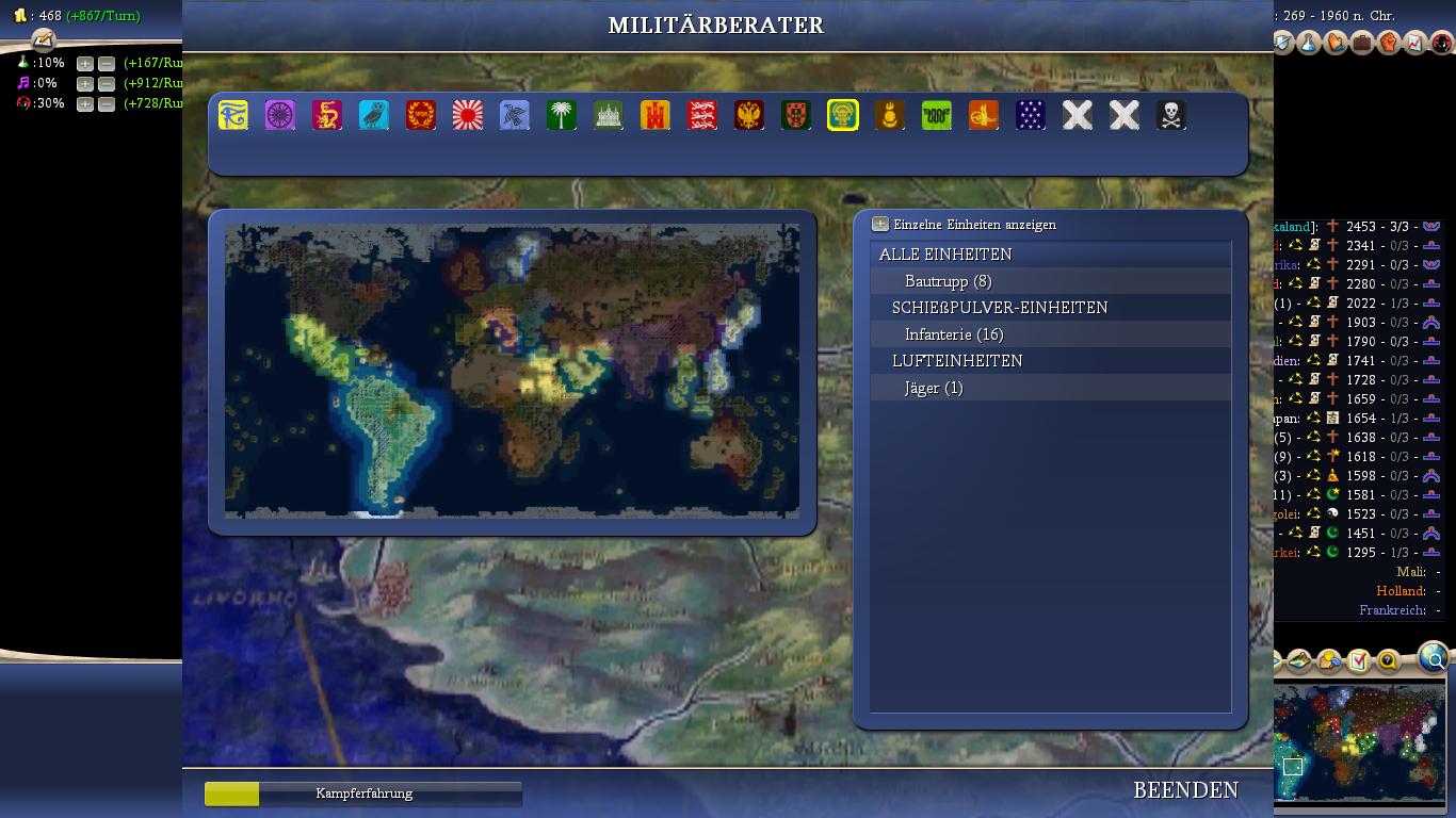 Starting somewhat after 1800 the game mechanic grants you a research boost. This will enable you to catch up in technology until eventually becoming the tech lead. At this time I usually never focus on military. Mainly because: By the time you have built an army and shipped it to Europe or Asia, it’ll be deprecated units. This is why in 1960 I basically had no army except for the units defending my cities.