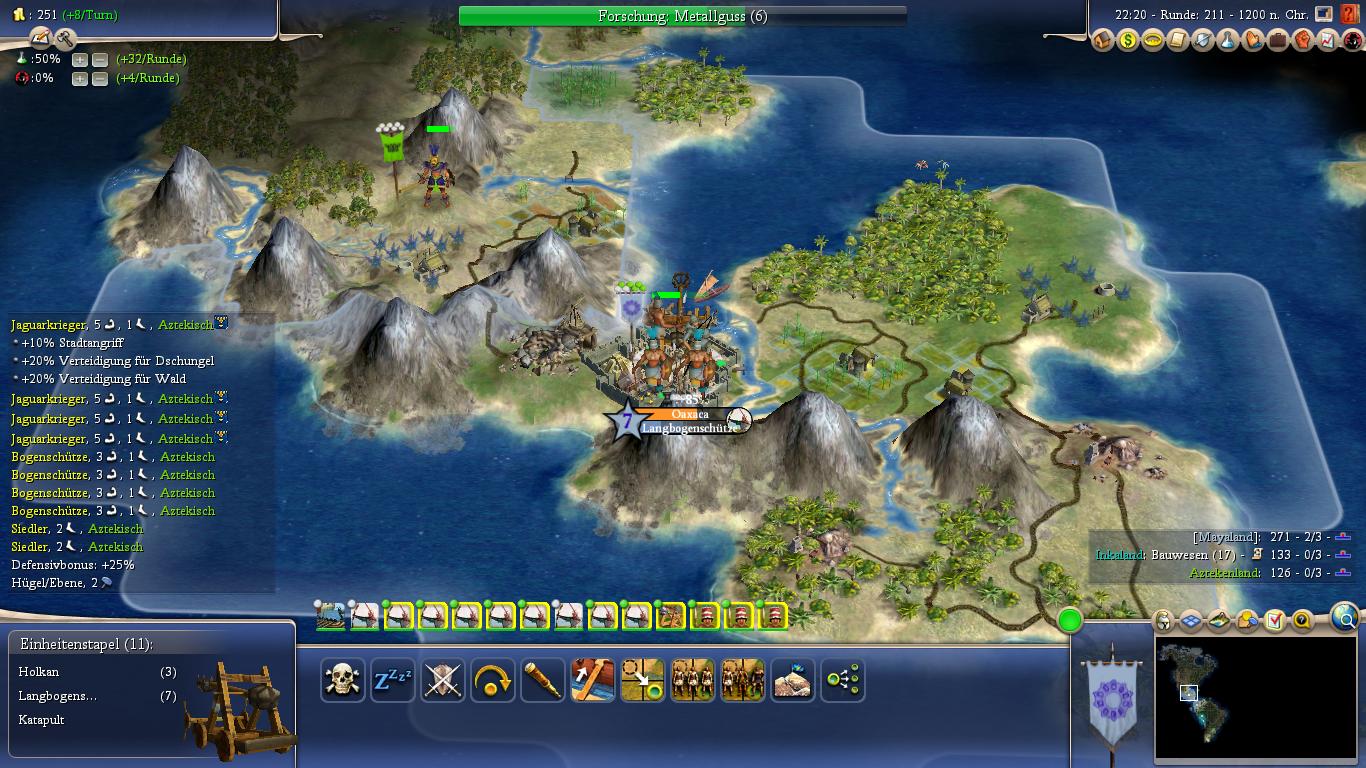 The Aztecs spawn in turn 214, 1195 AD. They arrive with 4 Jaguar warriors (5 combat strength) and 4 archers (3 combat strength, but bonus on hills and in cities). I was able to take them down with 7 longbowmen, 3 Holkan and 1 catapult, with several units left.