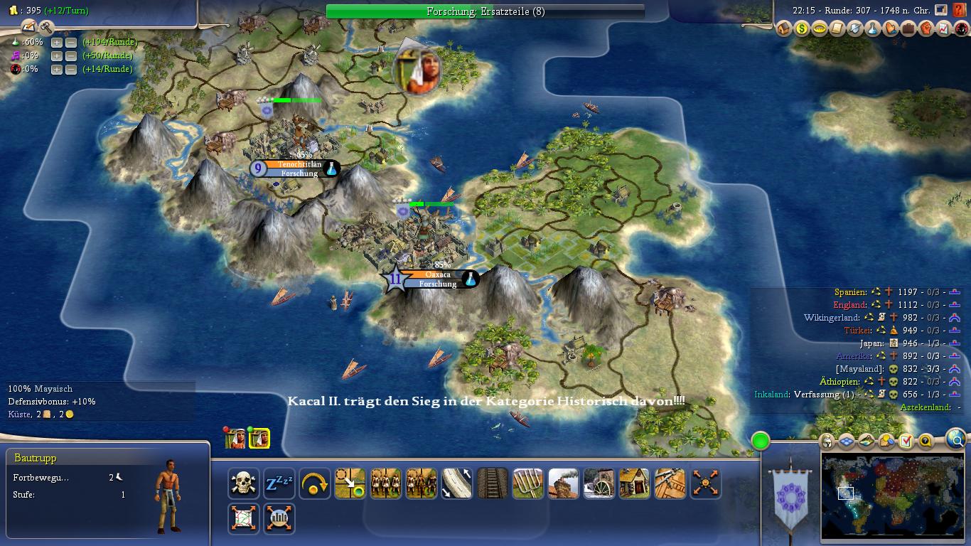 I rarely had an economic stability rating of above 1 star, it always worried me. Yet I managed quite well: First, defeated the Aztecs and never settling Tenochtitlan. Instead I went for coast cities: Olximche first. After the Aztec not-spawn: Mayapan (right north of the Aztec Spice, later with a horse – first I regretted missing the fish 1W of that tile, then I was glad to be further away from French New Orleans) and also Coyuca (right north of the Aztec Deer, 1S of the mountains). Also settled Jamaica for Sugar and Spice, and experimented a lot with Civics switches.