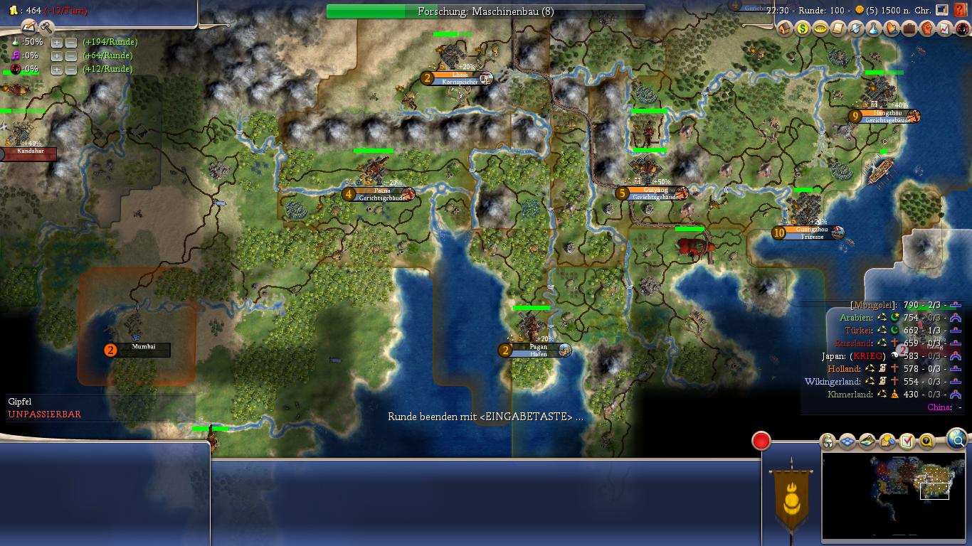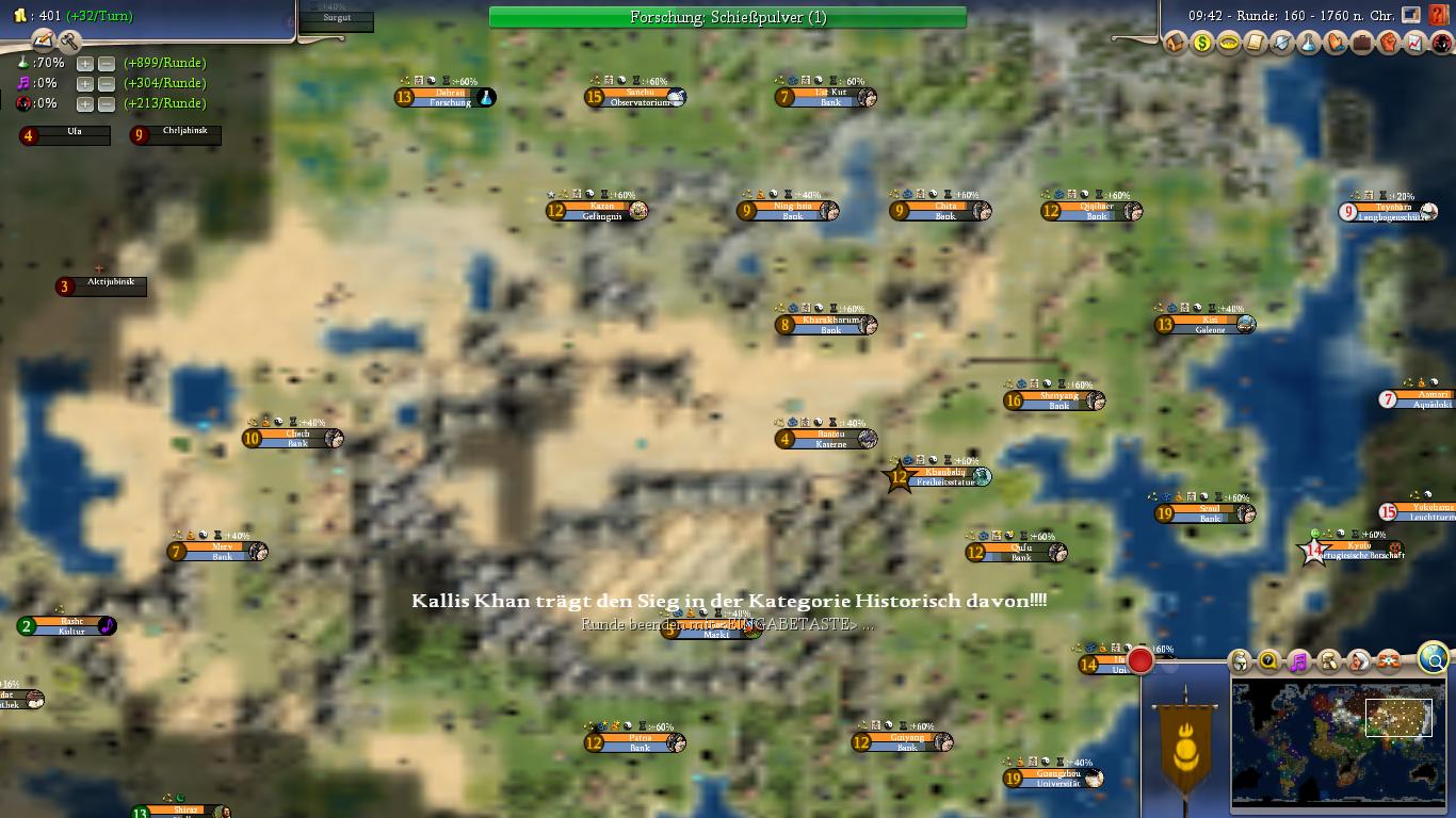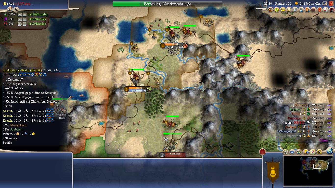 With all stability factors configured in a way that Mongolia supports an incredibly large empire, this sets the foundation for having a lot of fun in the endgame. After the initial conquests, build up your economy. Both the Chinese and the Siberian cities on grassland and surrounded by forests make for great cities, both in size and production. This set, reaching the tech lead position is not a problem either.