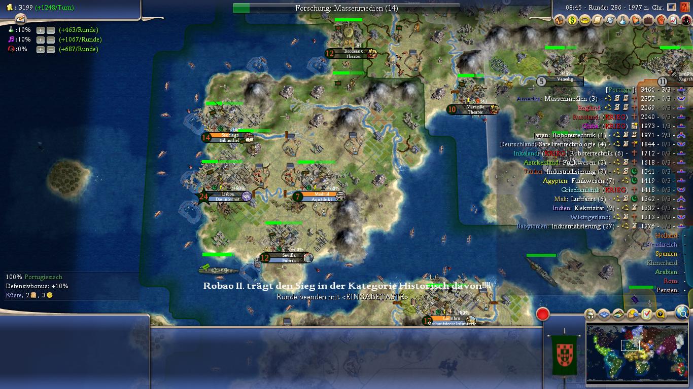 As usually I continued playing Rhye’s and Fall Portugal beyond the UHV and the result was quite nice. Portugal ruling the world, overcoming Spain and predominating Europe, South America, South(ern half of) Africa and most of Southeast Asia!