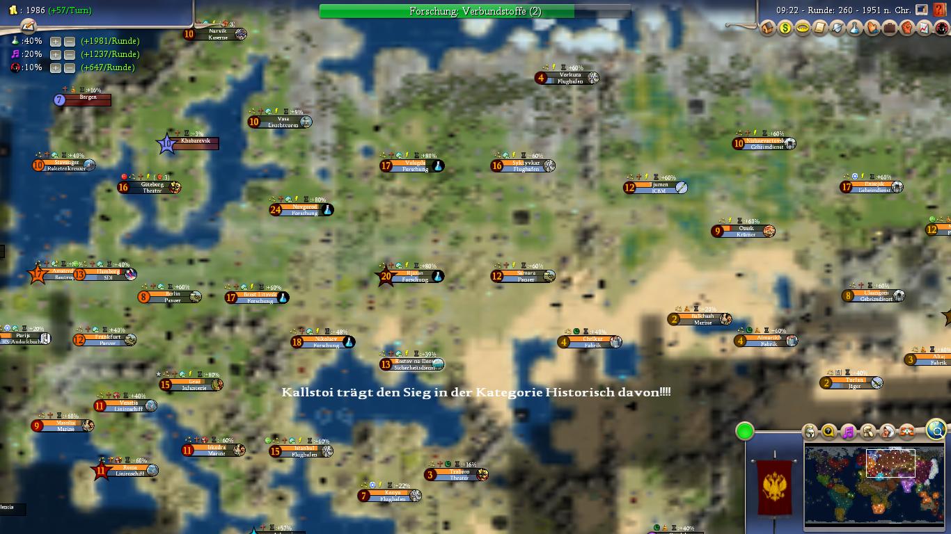 I’m pretty sure in one RnF patch the UHV goal has been revised to only requiring 4 cities in Siberia by 1700 AD. Otherwise my victory as shown above wouldn’t have been possible. If you played well in the European theater you should have some decently sized cities there. Building some settlers to colonize Siberia is not a hard thing then.