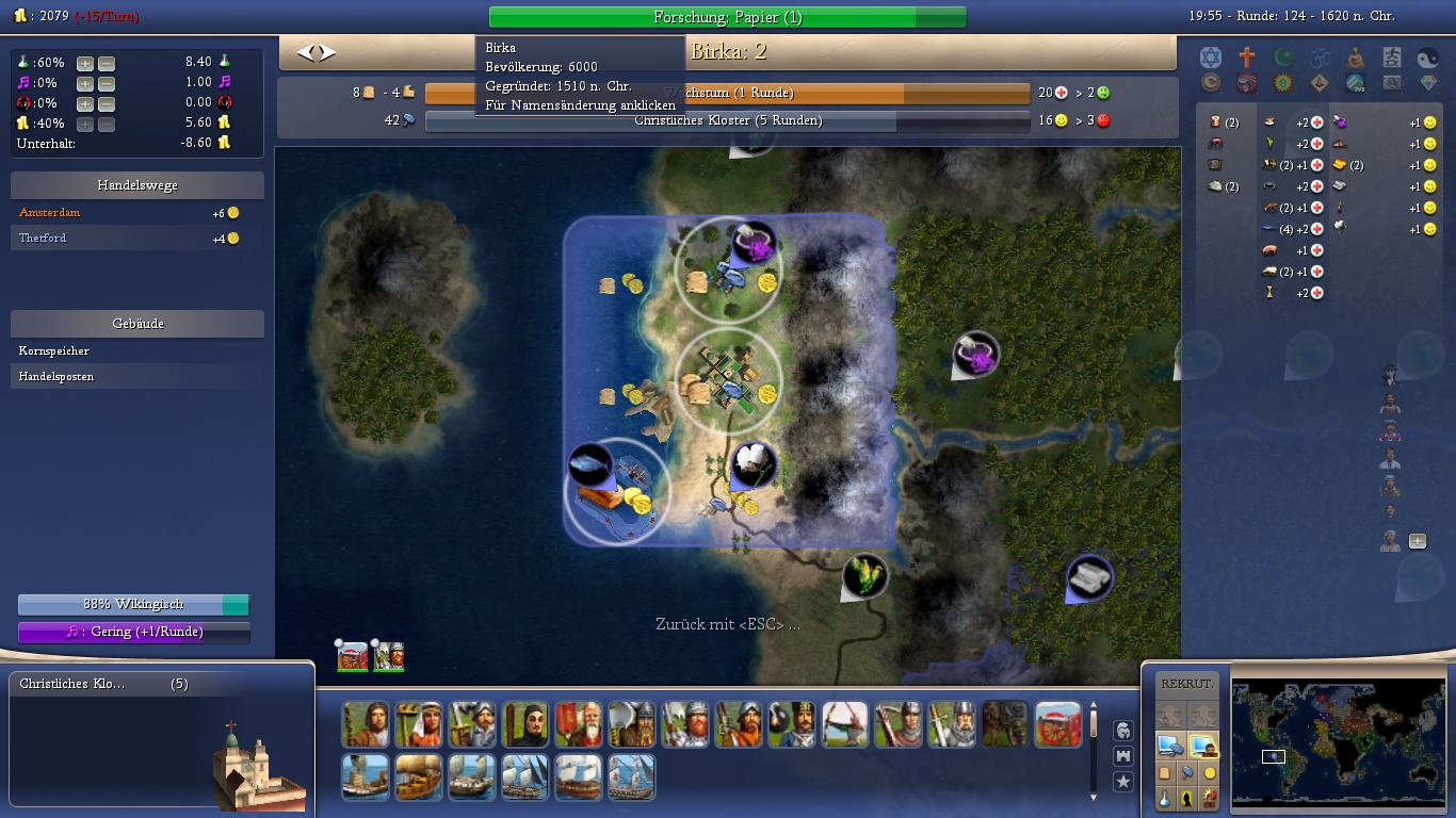 Berserker replace maces, have a +10% bonus against cities and start with amphibian. This resembles the original viking strategy of hit and run attacks from sea. At least with my way of playing I rarely load units on ships again, after I captured or razed a coastal city. I usually continue my raid through enemy land and march on their capitals. That’s why I think the Berserker is nice, but not extremely useful in Rhye’s and Fall Vikings.