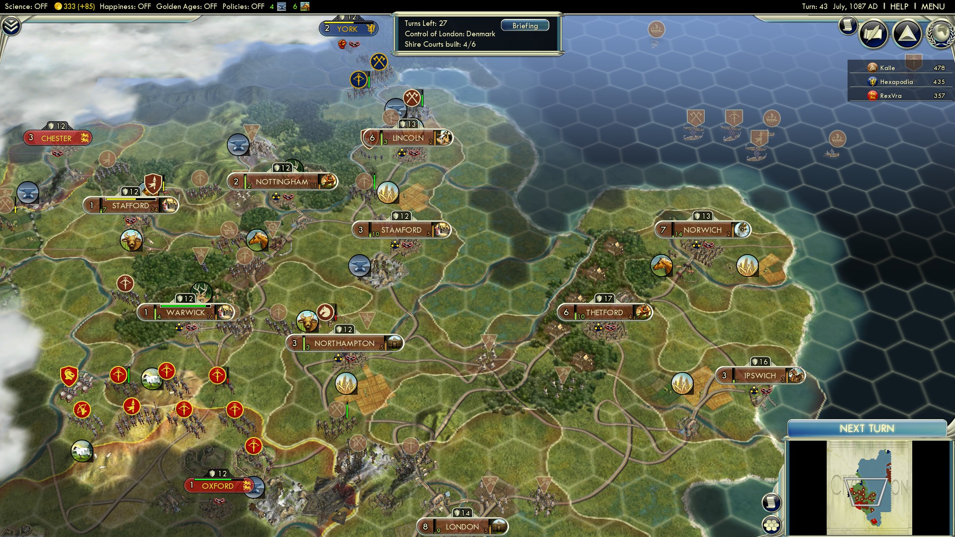 Challenged by the major defeat England had suffered at the hands of Denmark and Normandy, I decided to again try to succeed playing against the AI on Deity difficulty, following my very own “This was their finest hour” strategy guide. Unfortunately some things didn’t go quite as planned and I quickly found myself retreating, overwhelmed and desperate: