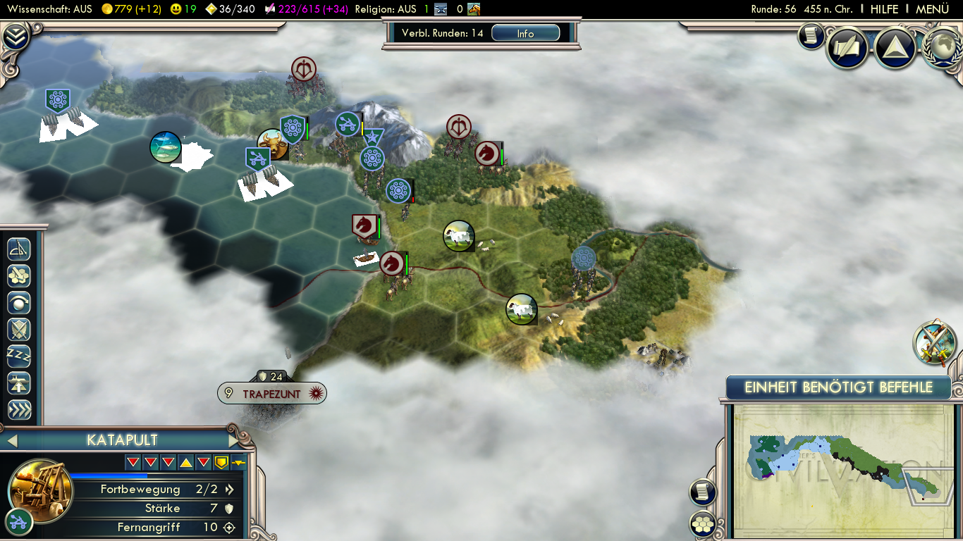 The sea route is a much more straight-forward approach considering the unique ability of the Celts to disembark using only 1 movement point. If you place your troops next to the coast and disembark the next turn, you can have catapults (and other units) with 5 movement points! This means you disembark, move your catapult in city-range, set up for ranged attack and fire! Using this strategy, you can conquer cities without your ranged units even get damaged.