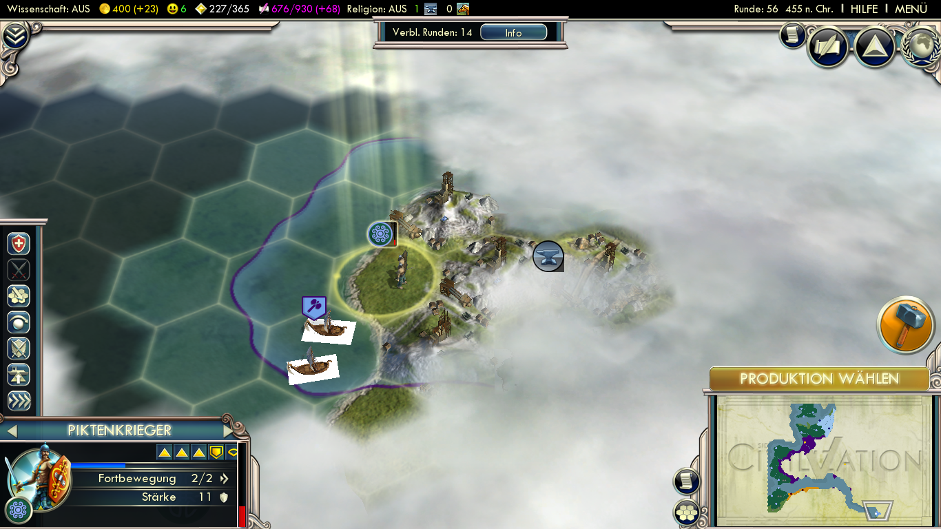 I think it is possible to get this achievement on higher levels of difficulty. The Celts have another unique ability: +50% combat strengths against civilizations with more cities. So I will give this another try, maybe on prince, and: Raze all Roman cities I conquer and immediately go for the military social policies. This should give the first units +50% flanking bonus and +50% for having less cities. The Pictish Warriors get an even higher flanking bonus. It should be possible…