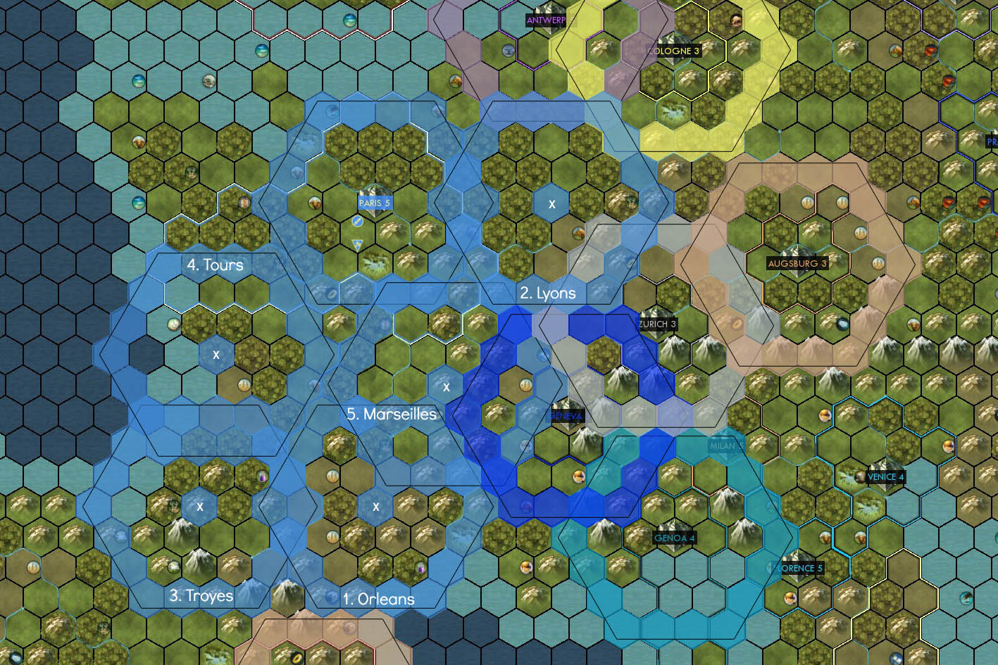 - Back to goal one: You must fully block the Pyrenees, so the 3rd city is Troyes in a very well defensible position.