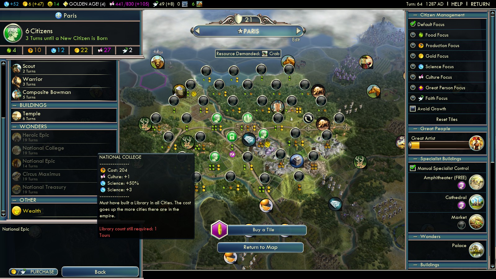 As usually I was going for Tradition -> Legalism and Liberty in the start. This gave me Citizenship (2), Republic (9) and Collective Rule (21) for the free settler much too late. Paris was a nice productive city already, having built a watermill, and aqueduct and already finished the National College!!! But as I started to work on Heroic Epic, Spain had already settled in France big time.