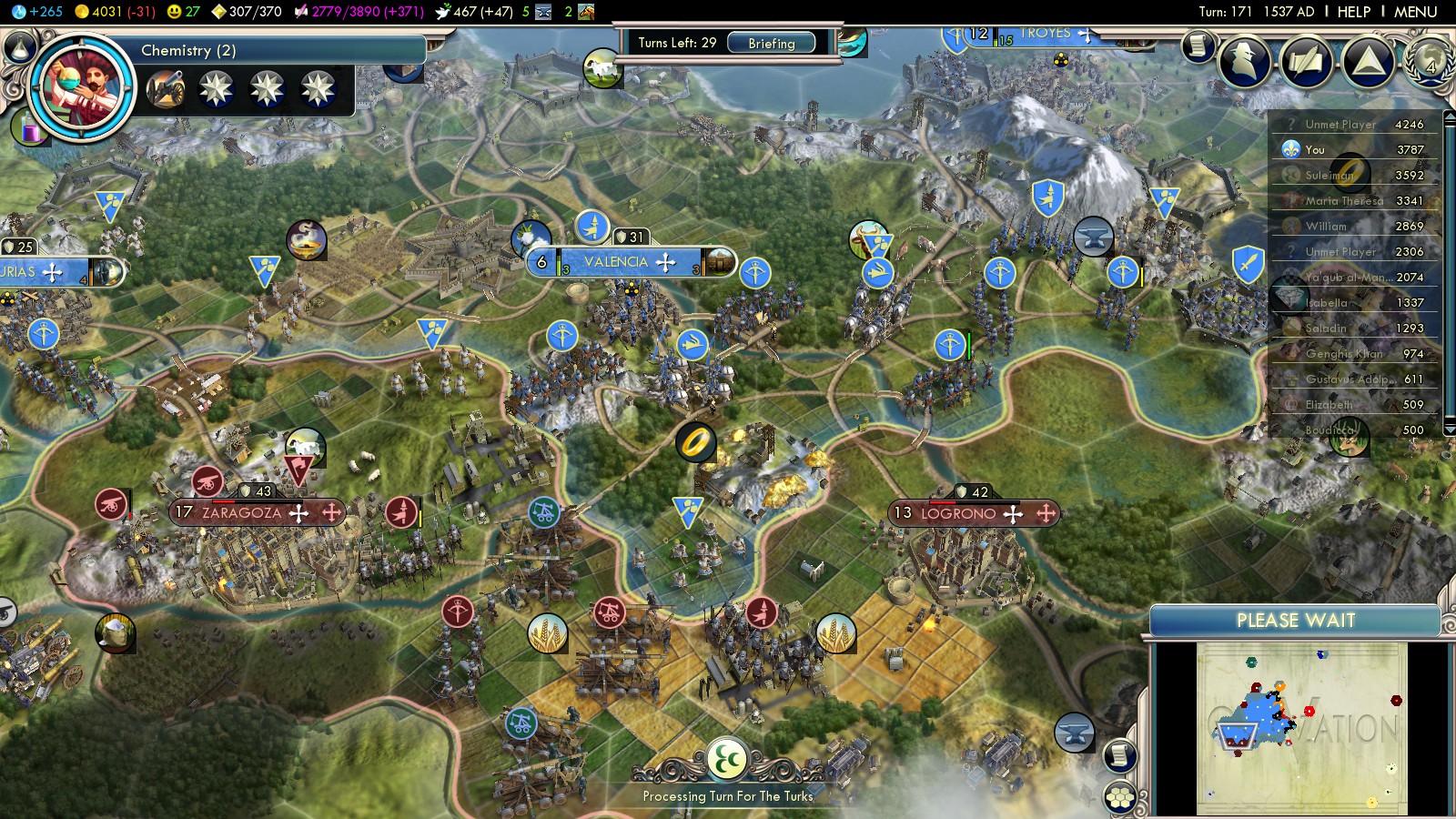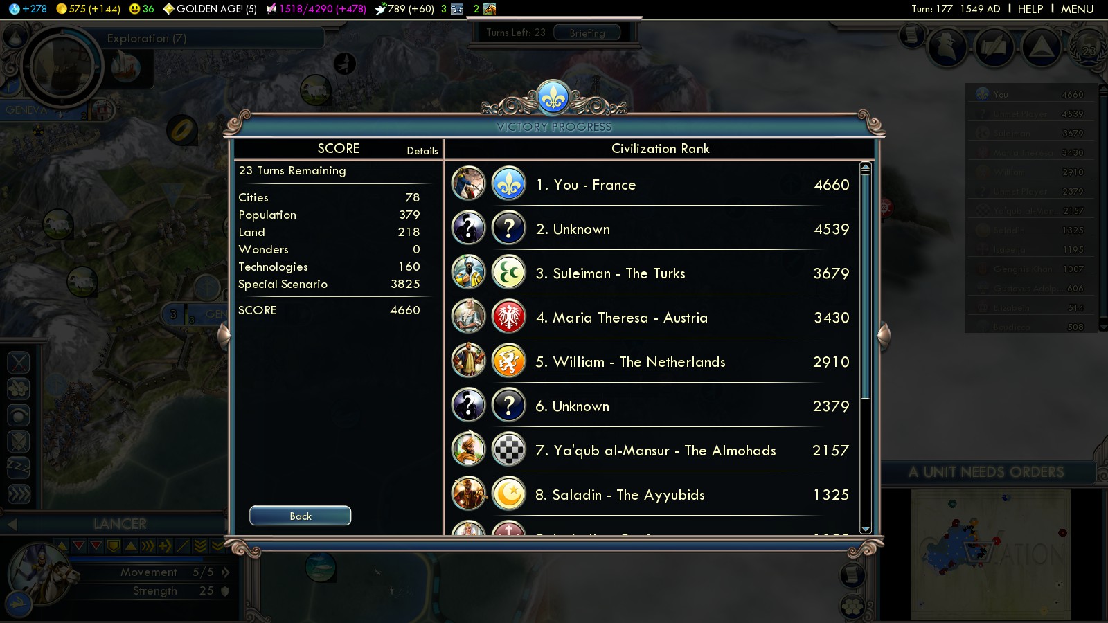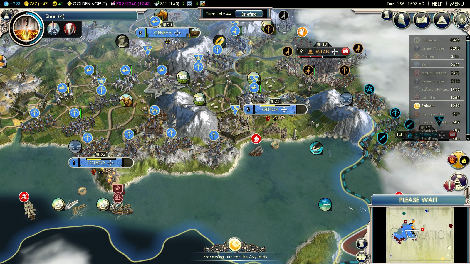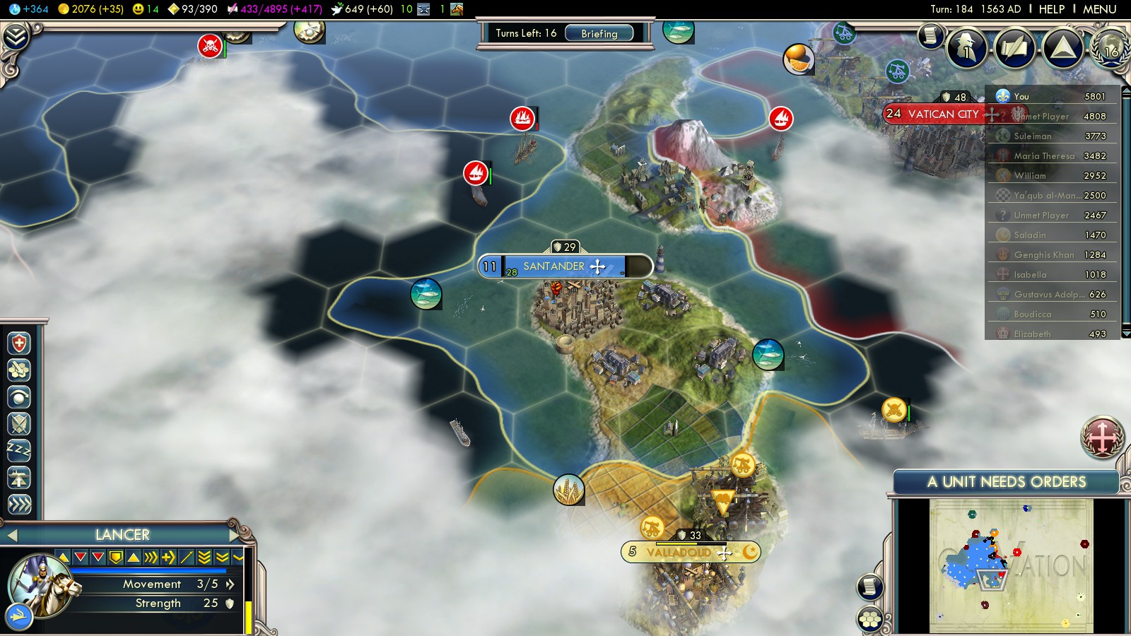 England was massing troops, both at land and sea at my border. As you could see in pictures above, they had claimed Brittany and Canterbury there was bigger than any of my cities. So I did what’s natural: I bribed the Celts against them, though not for what you see in the picture: It took 300G plus Gems to make it work. Also to keep the Spanish a bit more busy I bribed Saladin of the Ayyubids against them.
