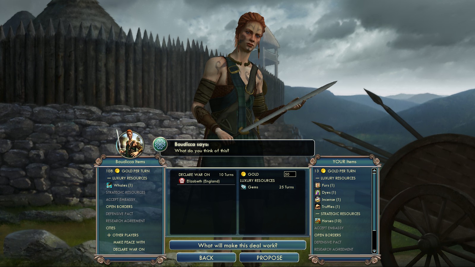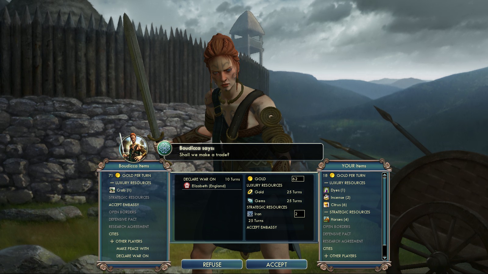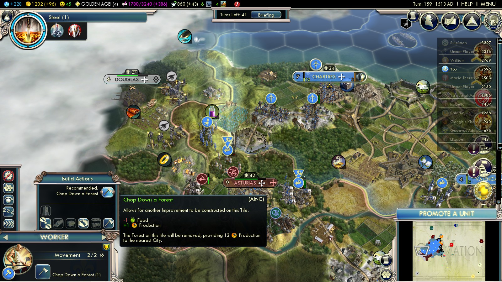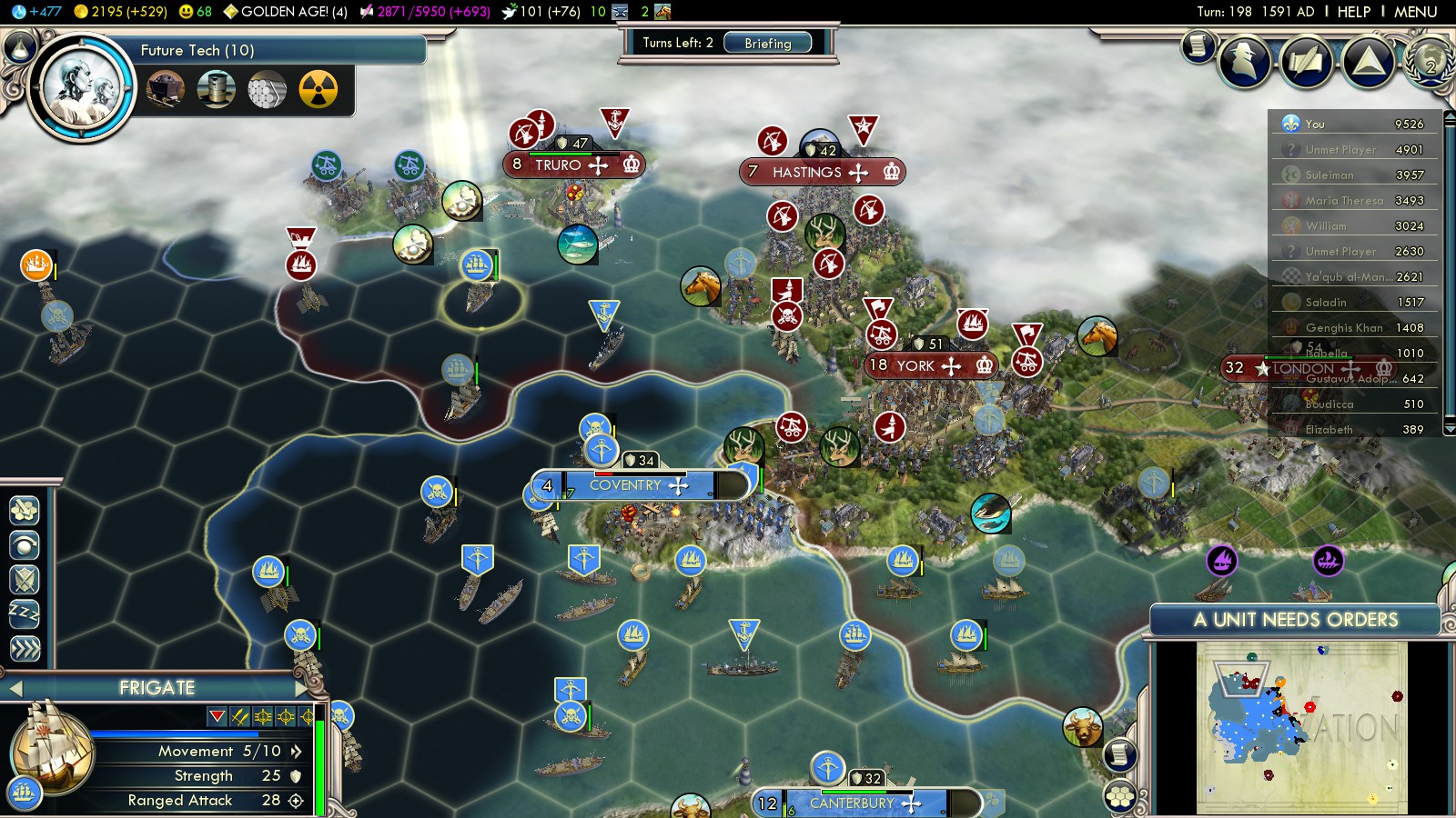 England was massing troops, both at land and sea at my border. As you could see in pictures above, they had claimed Brittany and Canterbury there was bigger than any of my cities. So I did what’s natural: I bribed the Celts against them, though not for what you see in the picture: It took 300G plus Gems to make it work. Also to keep the Spanish a bit more busy I bribed Saladin of the Ayyubids against them.