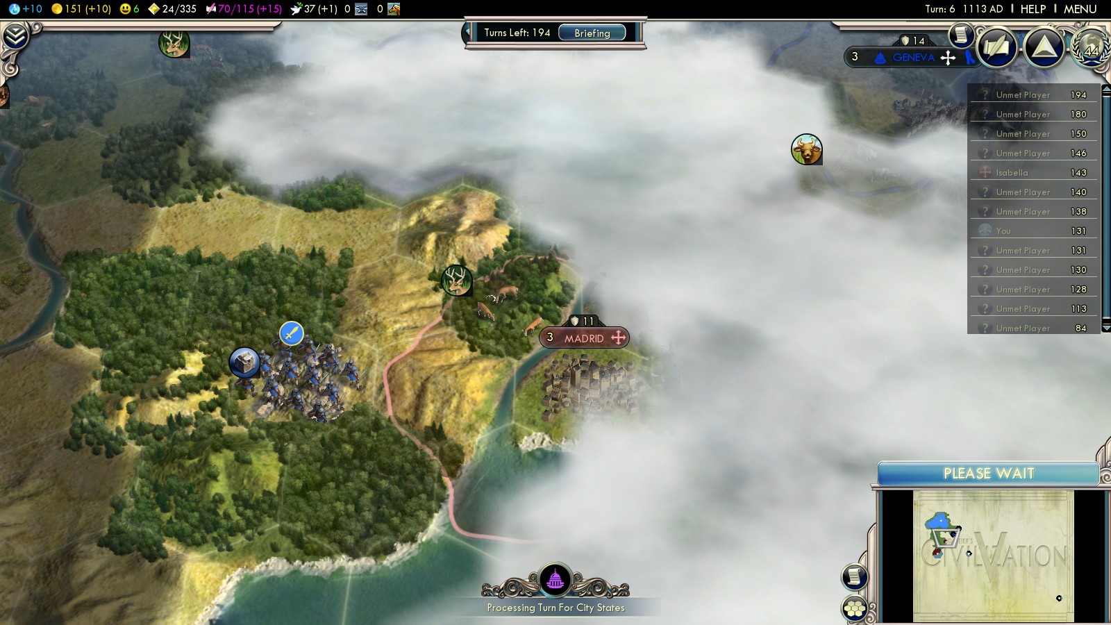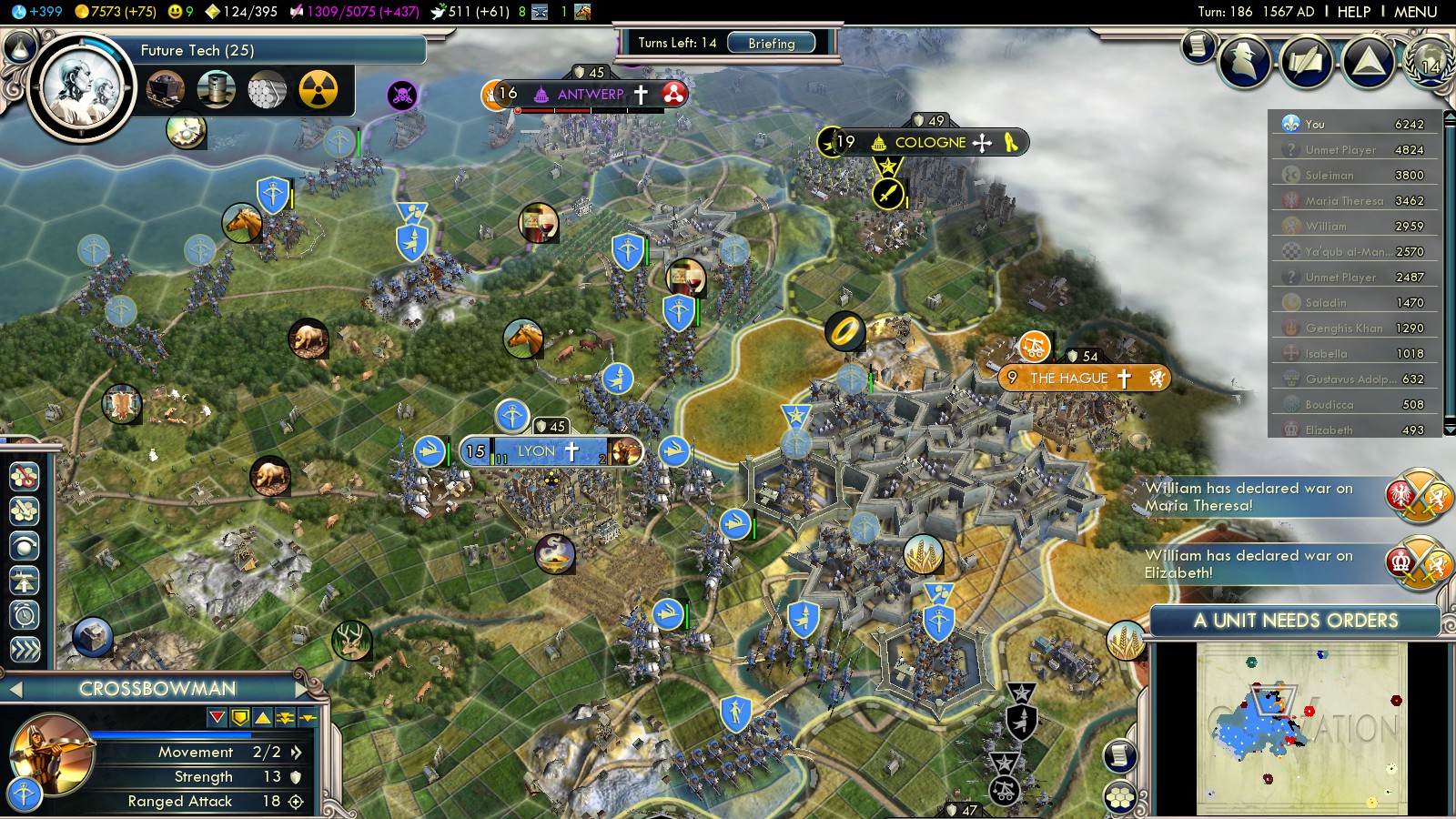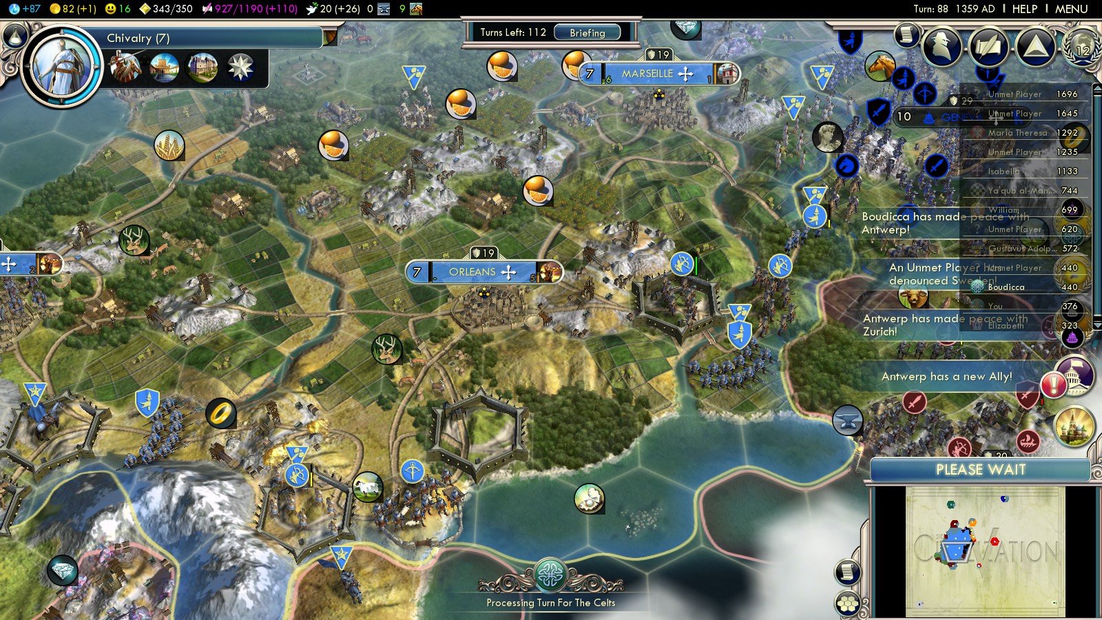 But I had to bribe the Netherlands into war with England so they couldn’t become part of that alliance (cost me 40GPT, 1 Luxury resource and 2 Iron).