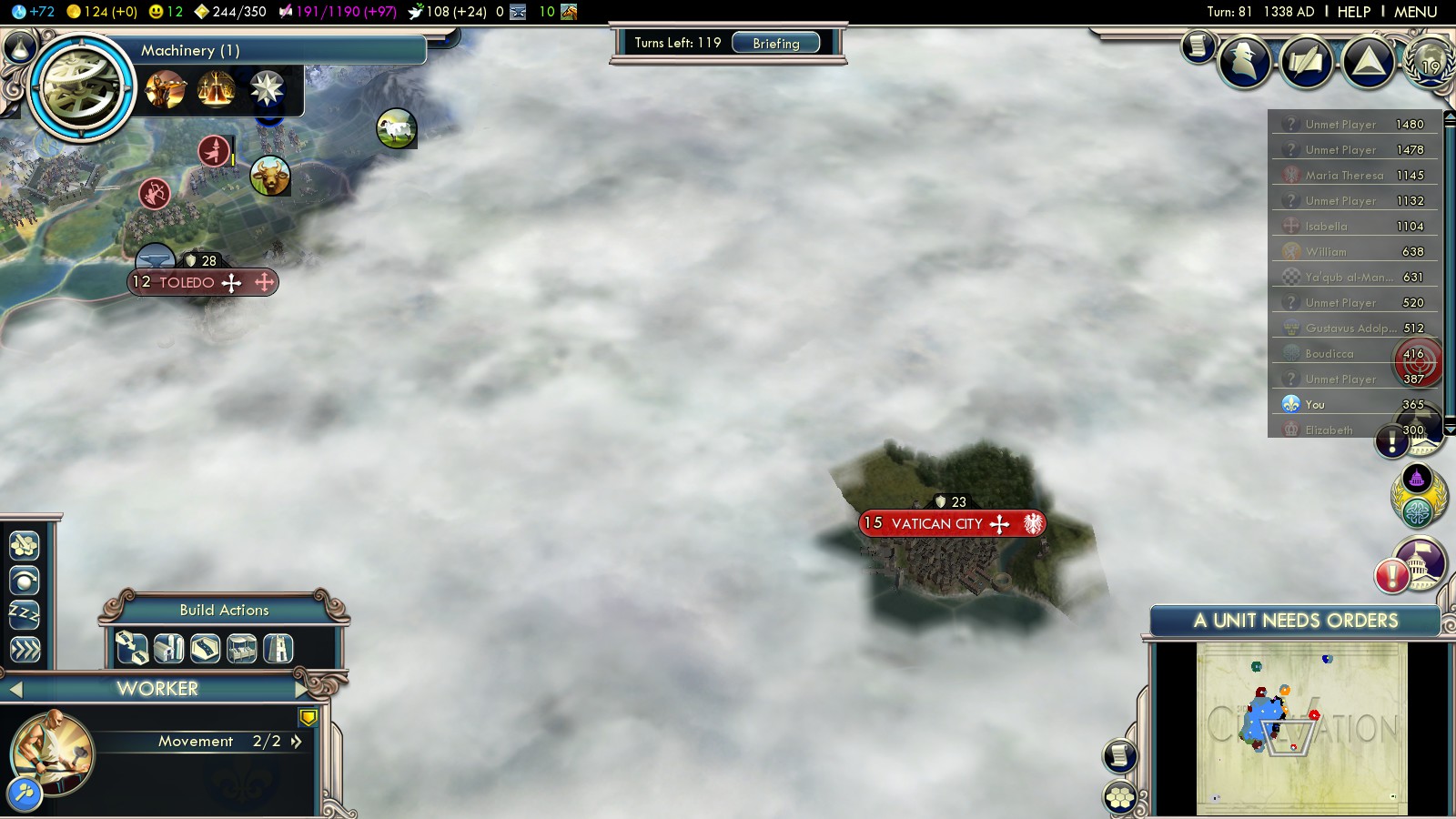- 190 – Vatican City, population 24 = 1200 VP (double for Holy City), still +300 next turn after liberation