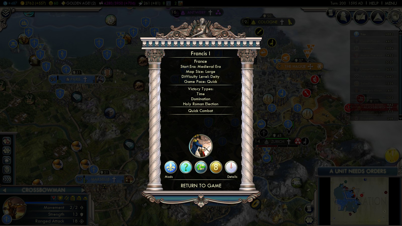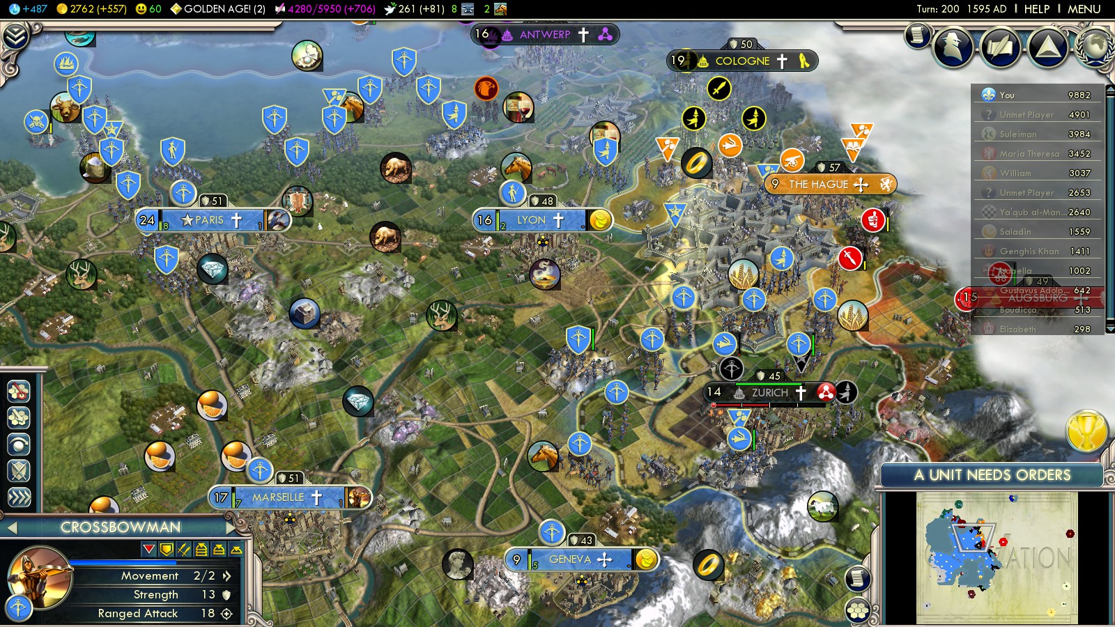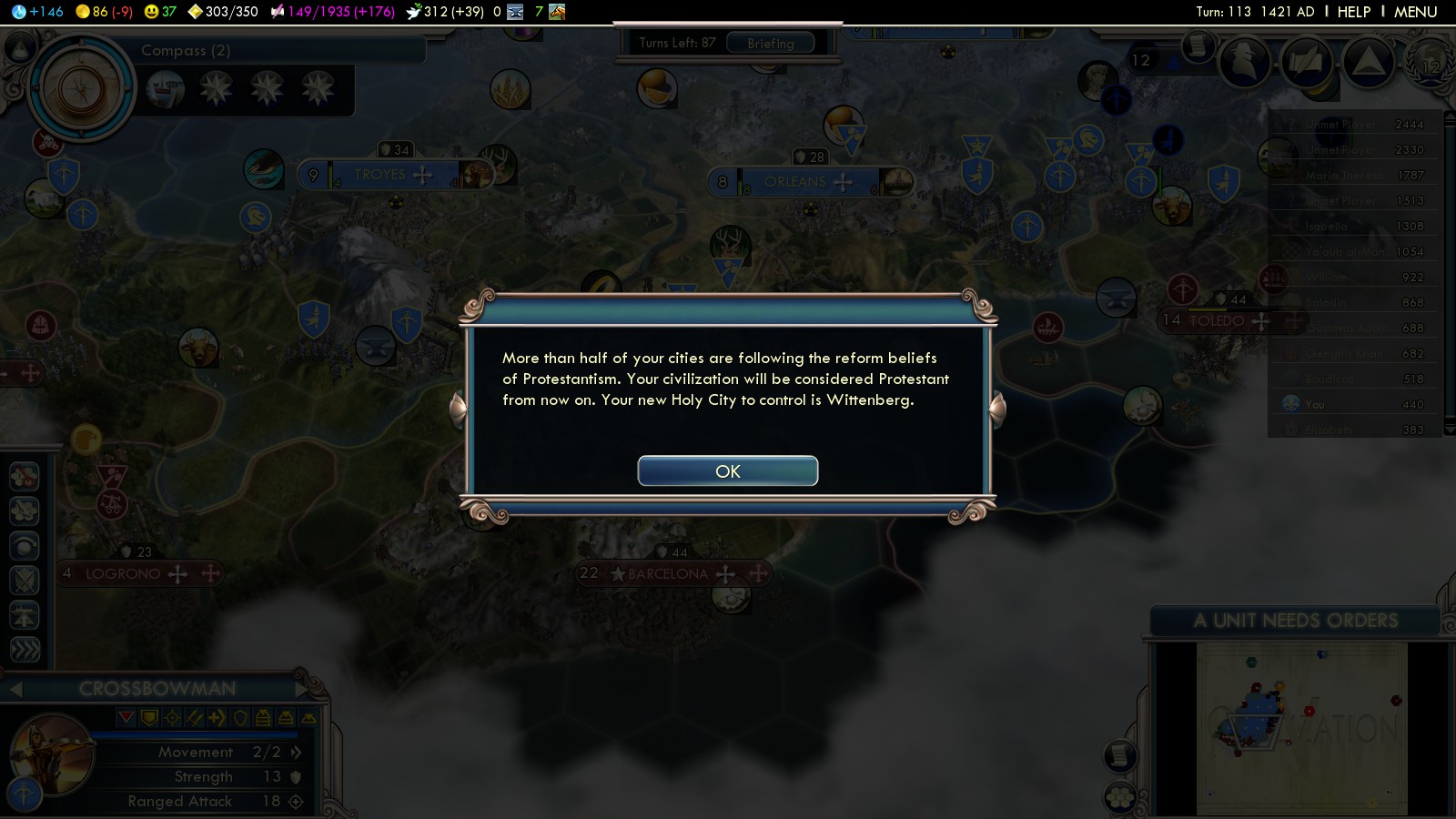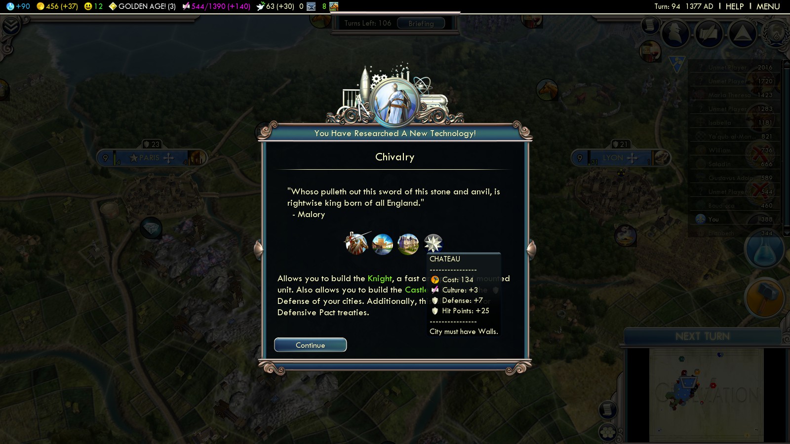 The timing of the Protestant Reformation couldn’t have been better – at least while playing Into the Renaissance France. I had just researched Chivalry to build knights and built the last national wonders. Being the 4th most productive civilization in Europe I quickly built Chateaus in all my cities and then could start pumping out units.