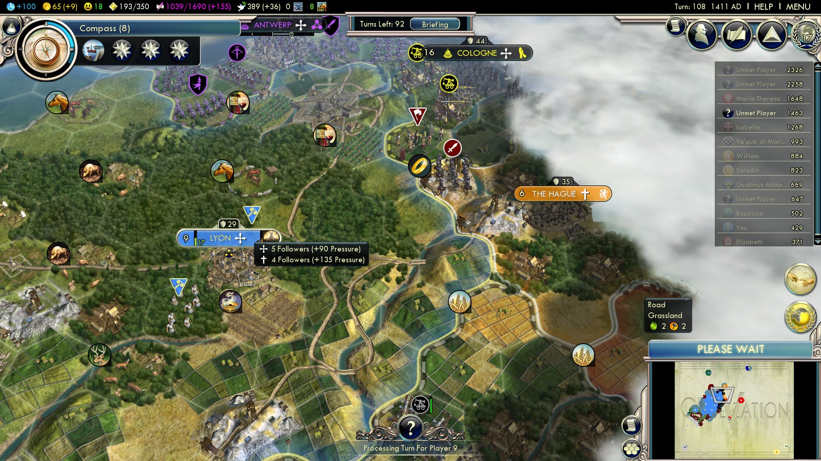 Important: Use all accumulated faith immediately to buy Cathedrals. Also I always have at least 1 Artist work in every city. They’ll grow too quickly anyways and you have to stop growth for happiness reasons, so they might just as well grow slower.