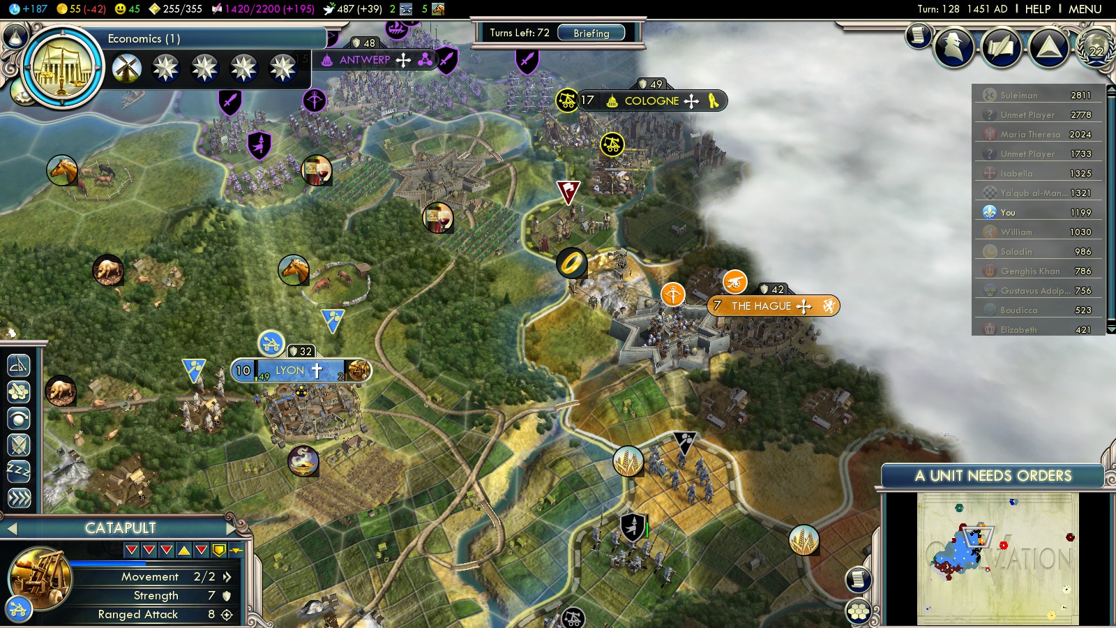 England was a different beast. Their strong navy resisted for quite some time. My Atlantic coastal city, Tours, could build 2 Privateers in 3 turns, and I also bought some with all that Gold. Only this helped overcome the English dominance. So finally Brittany joined the French Empire as did Coventry in Southwest England and Truro on Ireland. The following peace treaty granted me York.