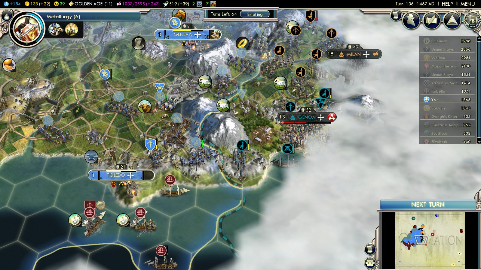 In the end the Netherlands was so aggressive, I couldn’t let them go any further. I had to declare war soon after just to use 1 Great General to get 3 of their Citadels! The Italian campaign started rolling and Milan was under fire. At this time I didn’t want war with the Dutch, but they refused to a reasonable peace.