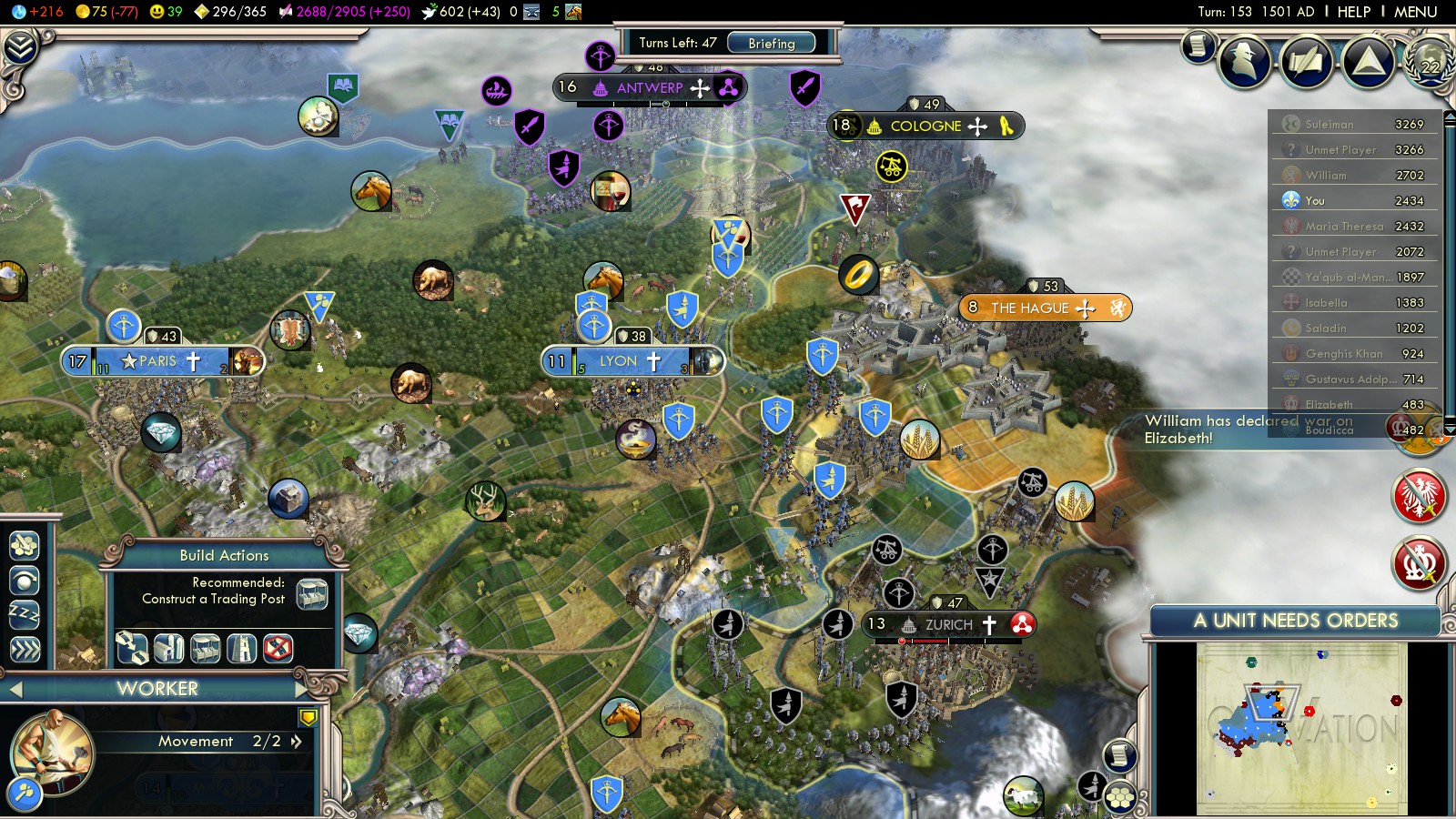 Have your workers both build road south to Orleans and Troyes as quickly as possible. You need to be able to outmaneuver your enemy there. Being able to move 3 tiles (along roads) and still fire is vital for your battles with Spain.