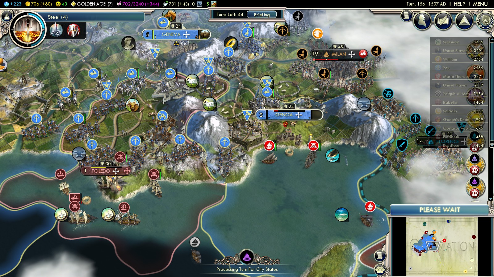 Until around turn 140 I had consolidated France as we know it (still with the unfortunate exception of Brittany). Toledo fell in turn 114 (350VP for population of 14), but got recaptured by the Spanish Mediterranean Fleet every single turn for more than 20 turns!!! So be prepared: Bring units in place to recapture it every turn again (+25VP per turn because it’s Catholic) and more units so you can advance on the Italian City states.