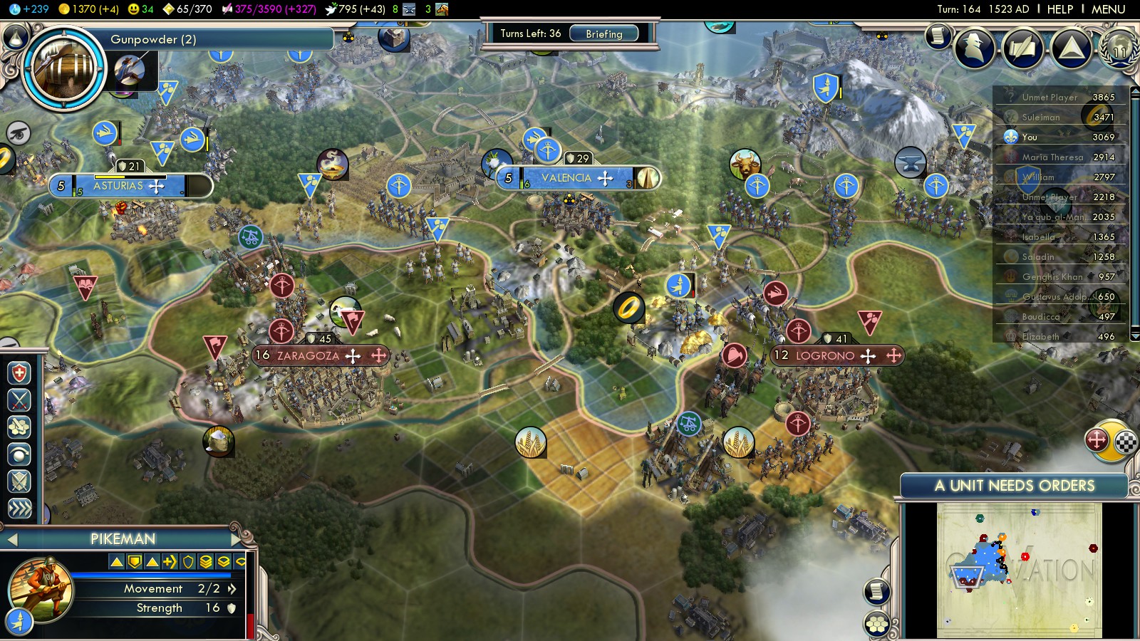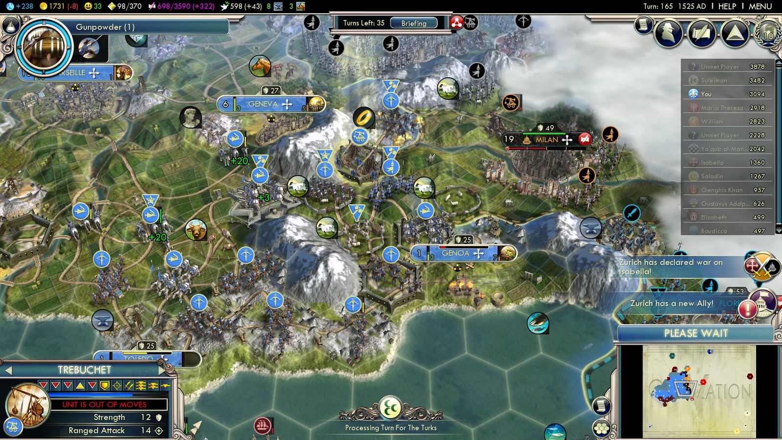 So you can pick the most valuable free tech Gunpowder (turn 166)