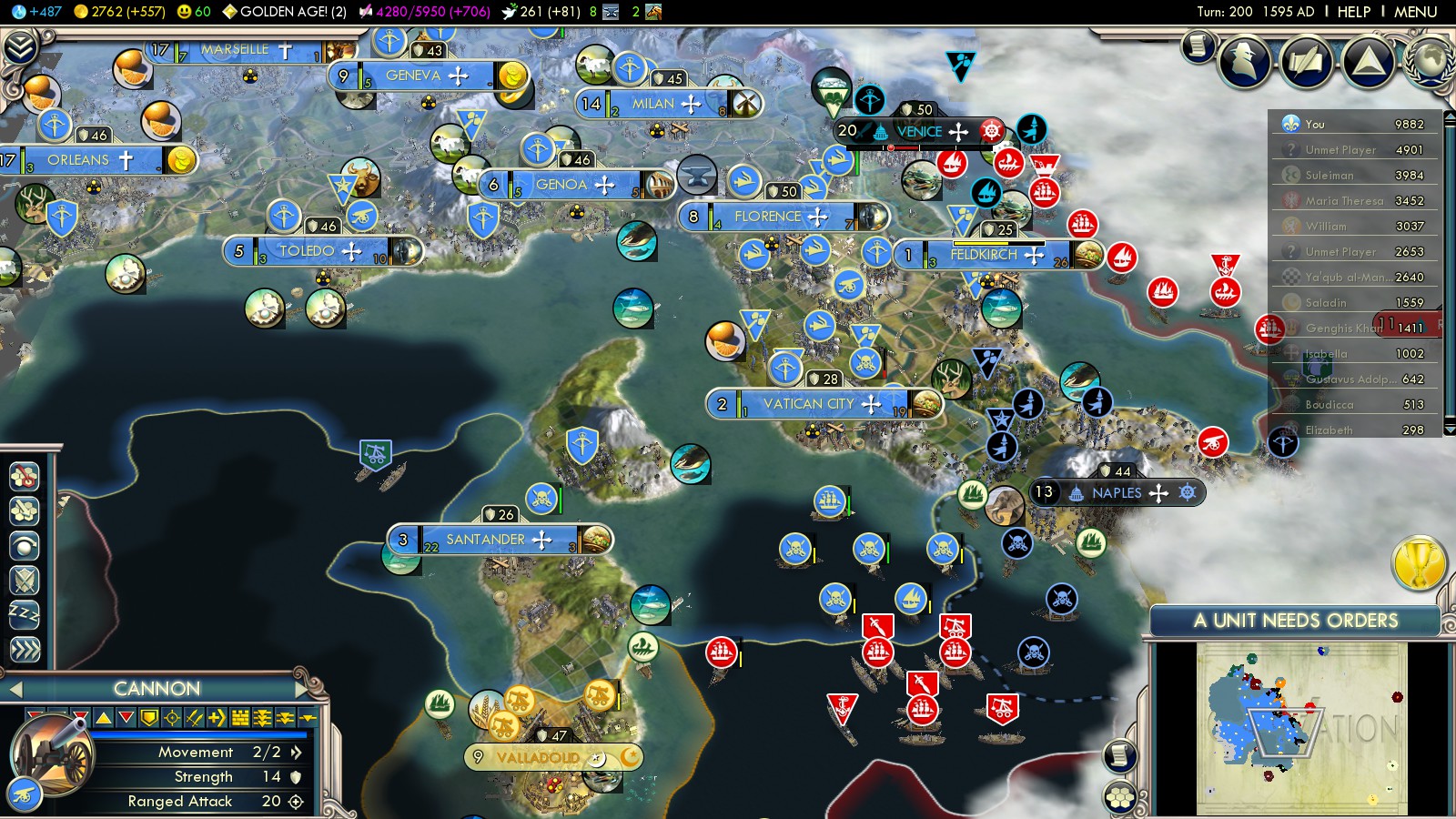 It took some turns to further advance into Italy, so only 10 turns after this peace with Austria I declared war again. Now Austrias fleet was busy capturing Santander, which I got from peace with Spain. I captured it later after having built my own fleet in Toledo and Barcelona. There’s one hill from where one can bombard both Vatican City and the other Austrian city they’re likely to found in Italy.