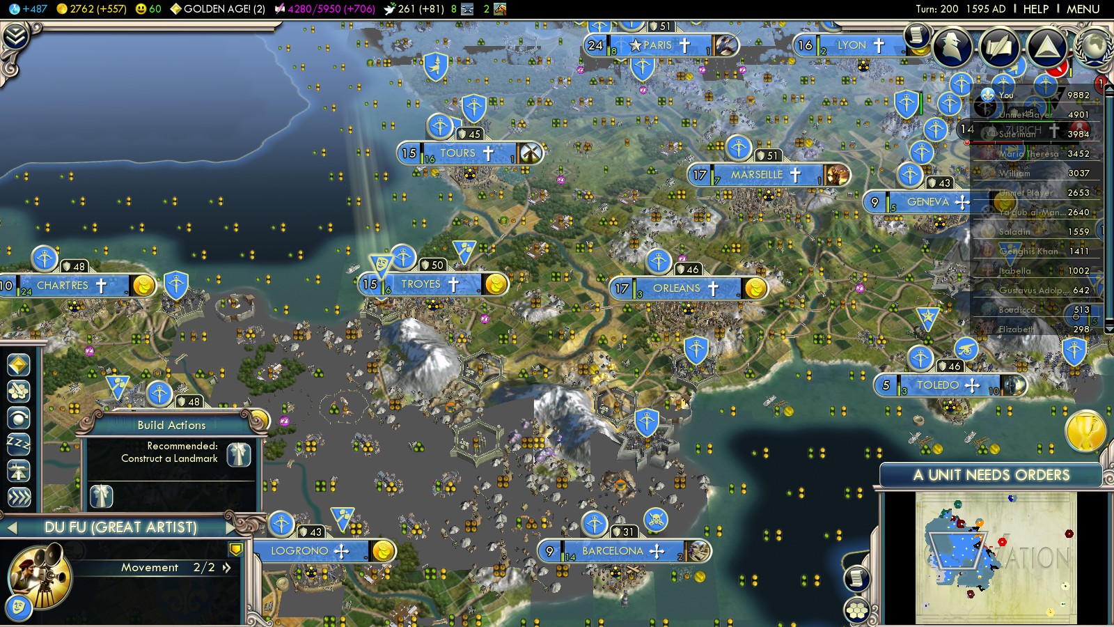 I lost count of the number of Golden Ages I’ve had in this game. There have been some early on until cities grew to the maximum. Then plenty more when Happiness increased and increased. In this scenario I rarely let cities grow past 12, so depending on social policies chosen you’ll have plenty of Happiness in the late game. I documented Golden Ages in turns 89, 155, 174, 195. By then I also had spawned a dozen Great Artists, which I in 90% of the cases use to build their unique improvement. On the picture of turn 200 on the right you can see I built 10 of those! TEN!!!
