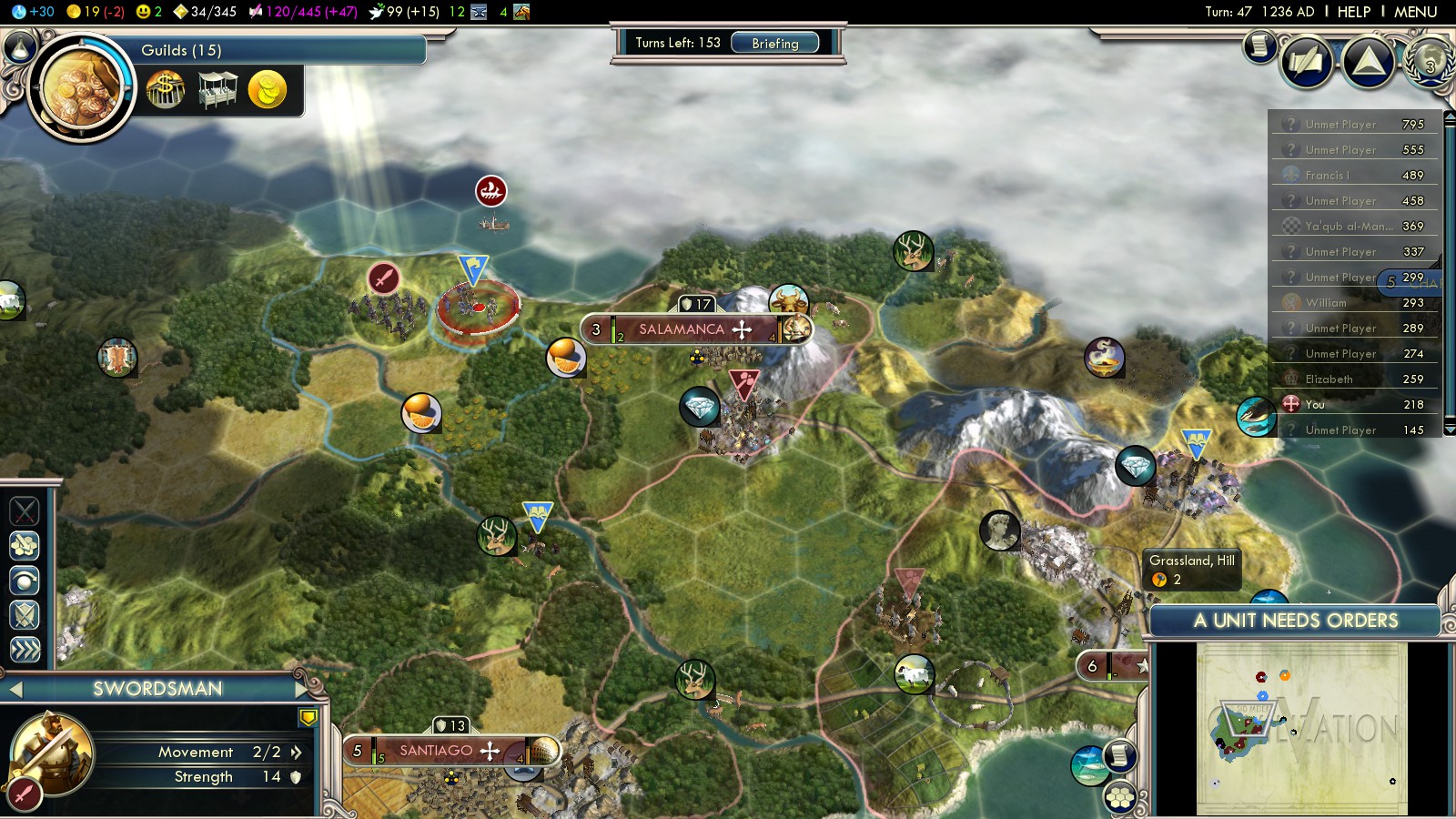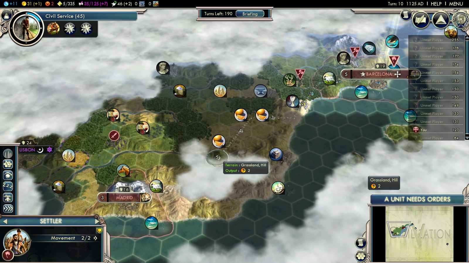 Have your workers immediately start building a road from Barcelona to Madrid. Build it in a way you pass by Toledo and Santiago, so you can found these cities quicker. At Madrid, build some more roads towards Lisbon. It’ll ally with the Almohads sooner or later and again you need to be able to maneuver and shoot, so roads are vital!