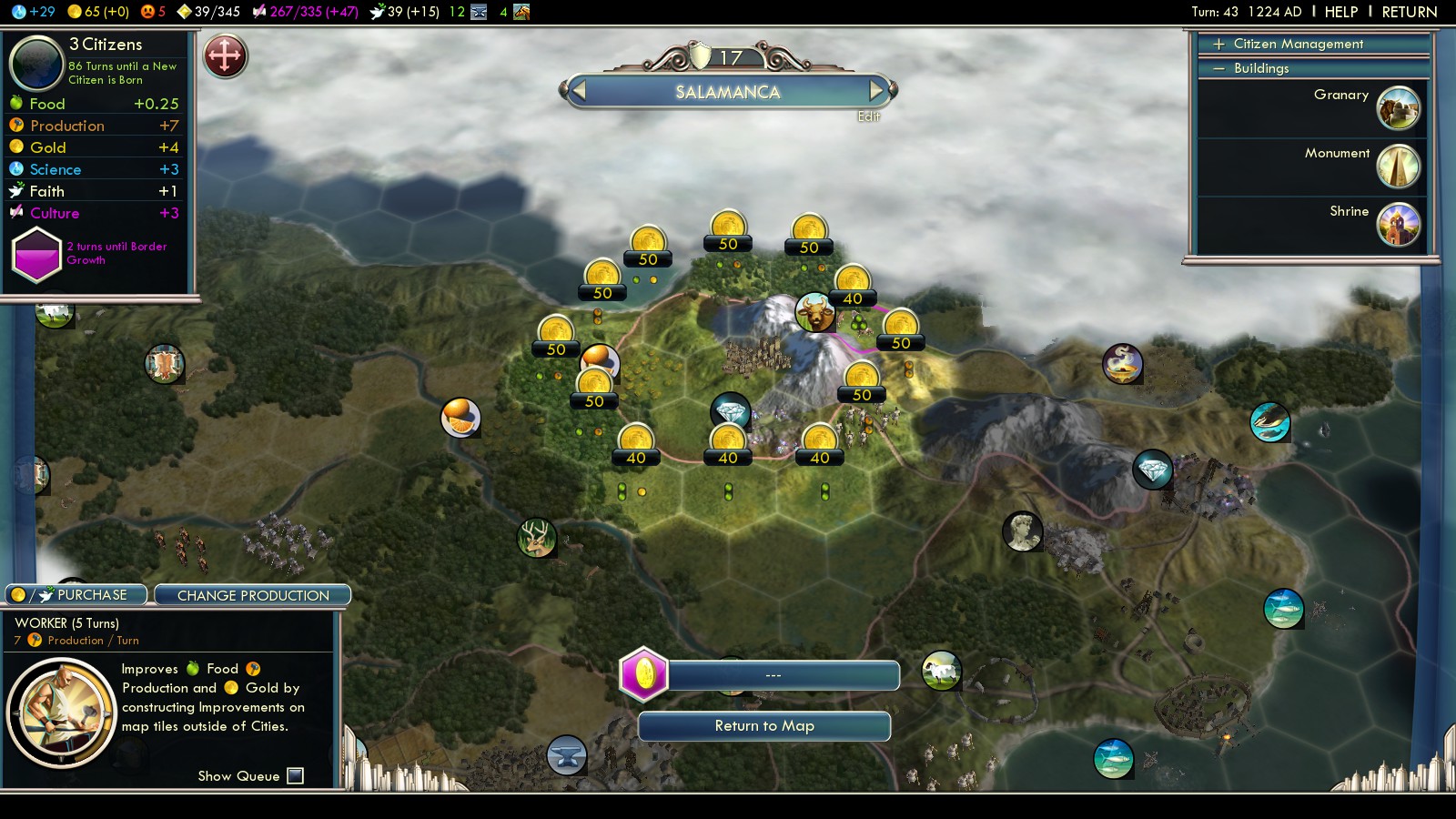 Only with Meritocracy in turn 45 my happiness rating was positive again, allowing me to grow cities at the normal rate. The build order includes many many workers to quickly improve the land, again giving priority to luxury resources for happiness: