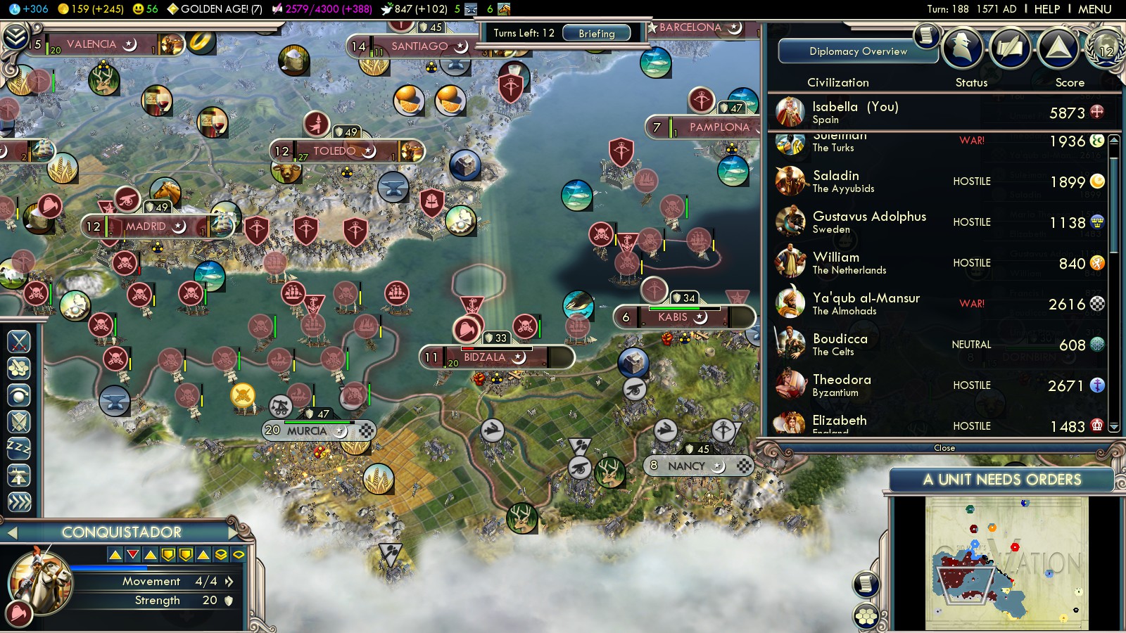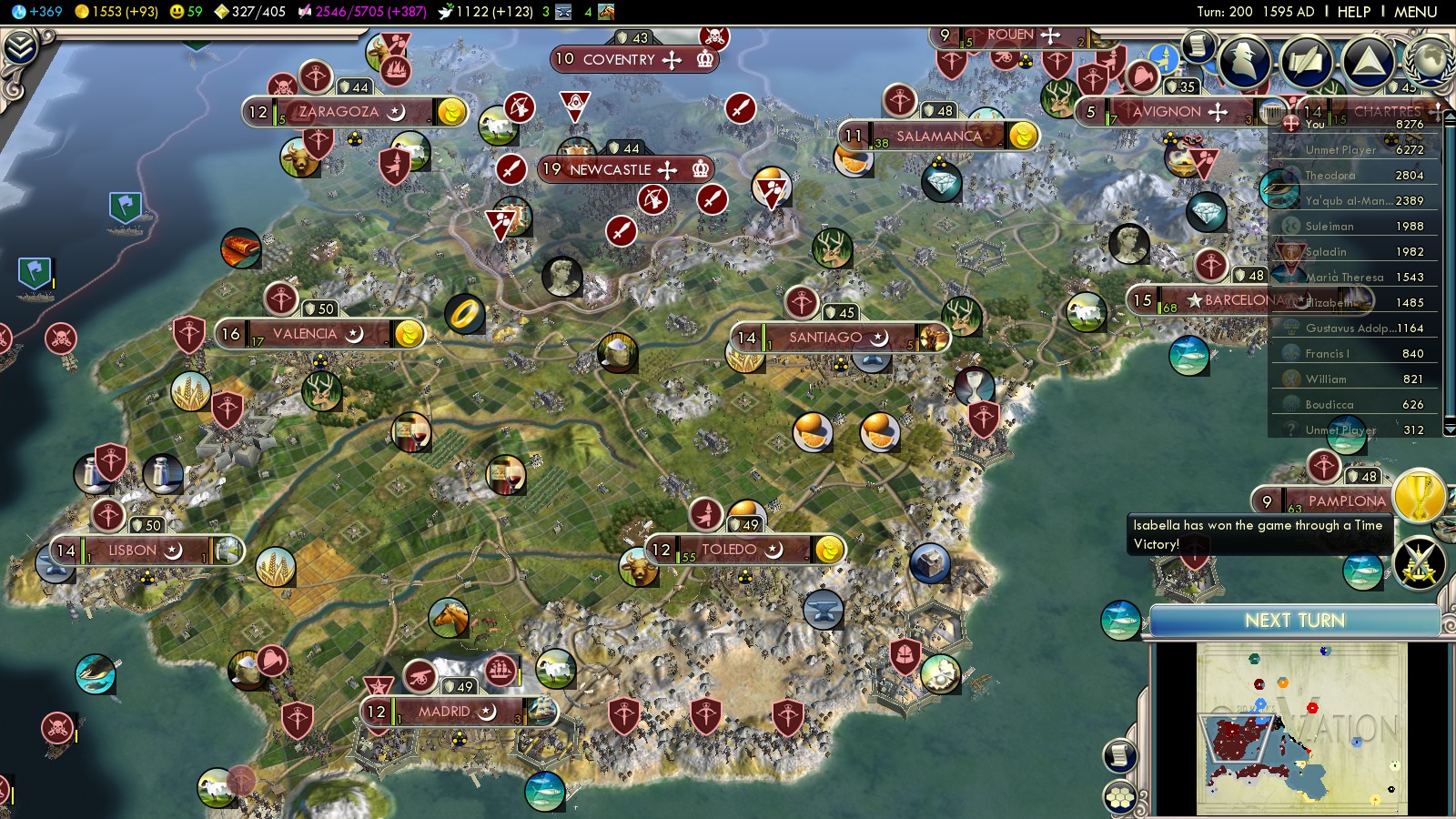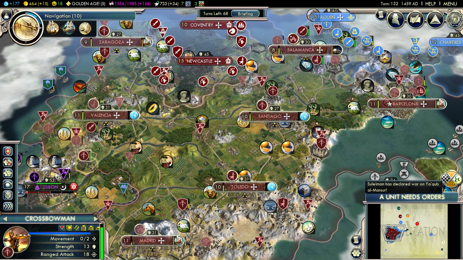 Then I had to reload some turns before, because with what happened, I could have never won this game: In turn 73 both England (2 cities in Spain already) and the Ayyubids declared war on me. Lisbon was an ally of the Ayyubids and threatened to capture one of my cities!!!