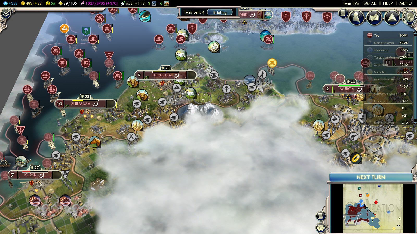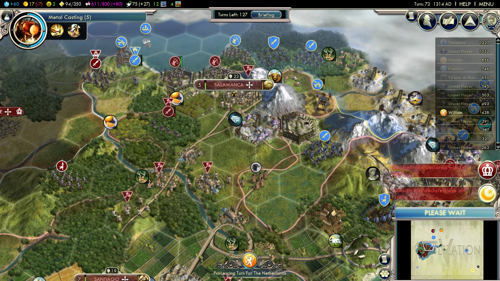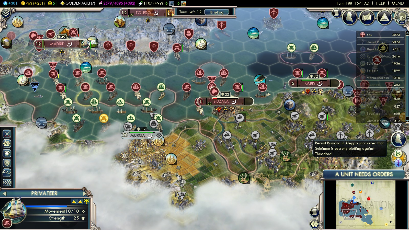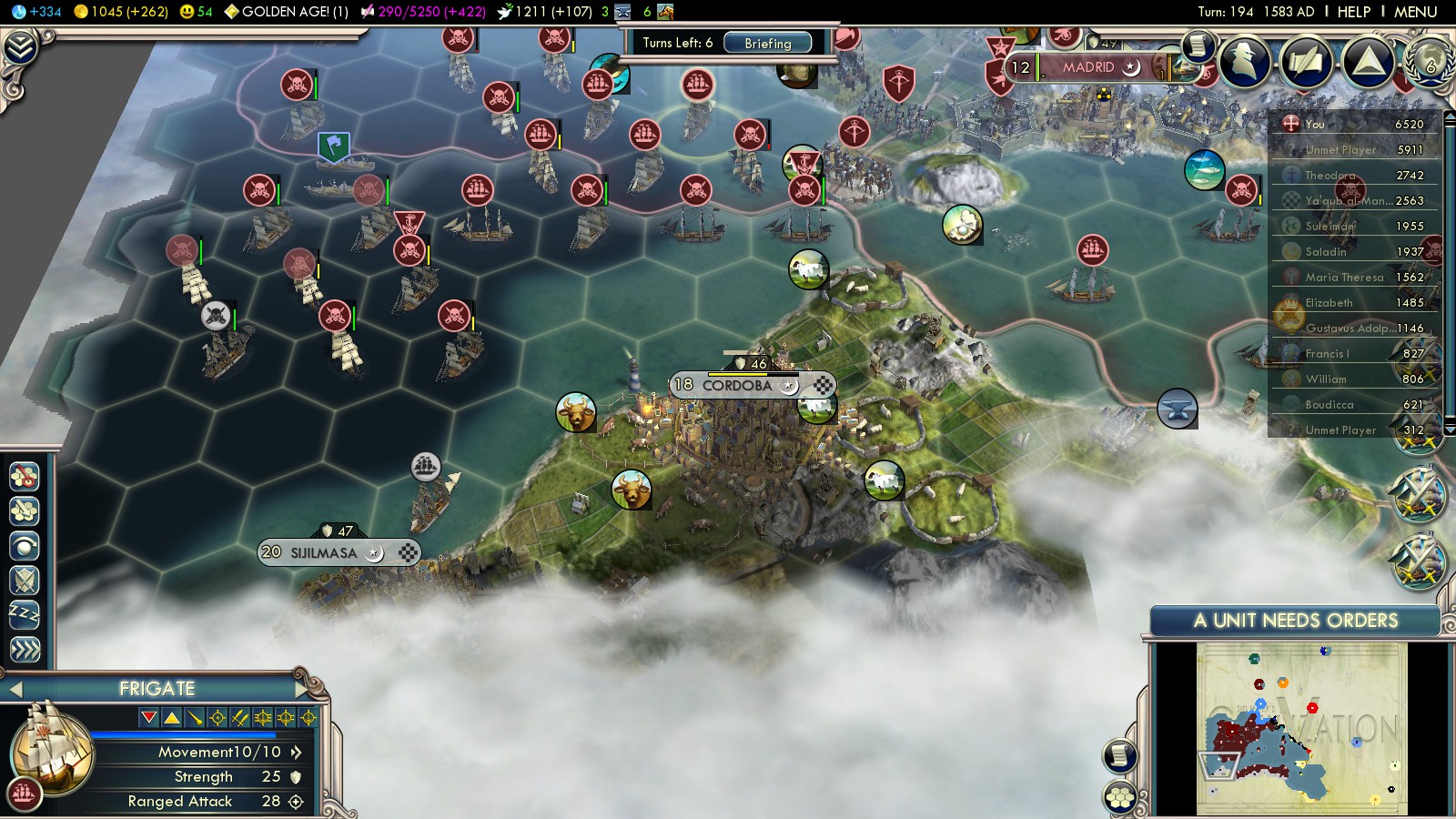 Then I had to reload some turns before, because with what happened, I could have never won this game: In turn 73 both England (2 cities in Spain already) and the Ayyubids declared war on me. Lisbon was an ally of the Ayyubids and threatened to capture one of my cities!!!