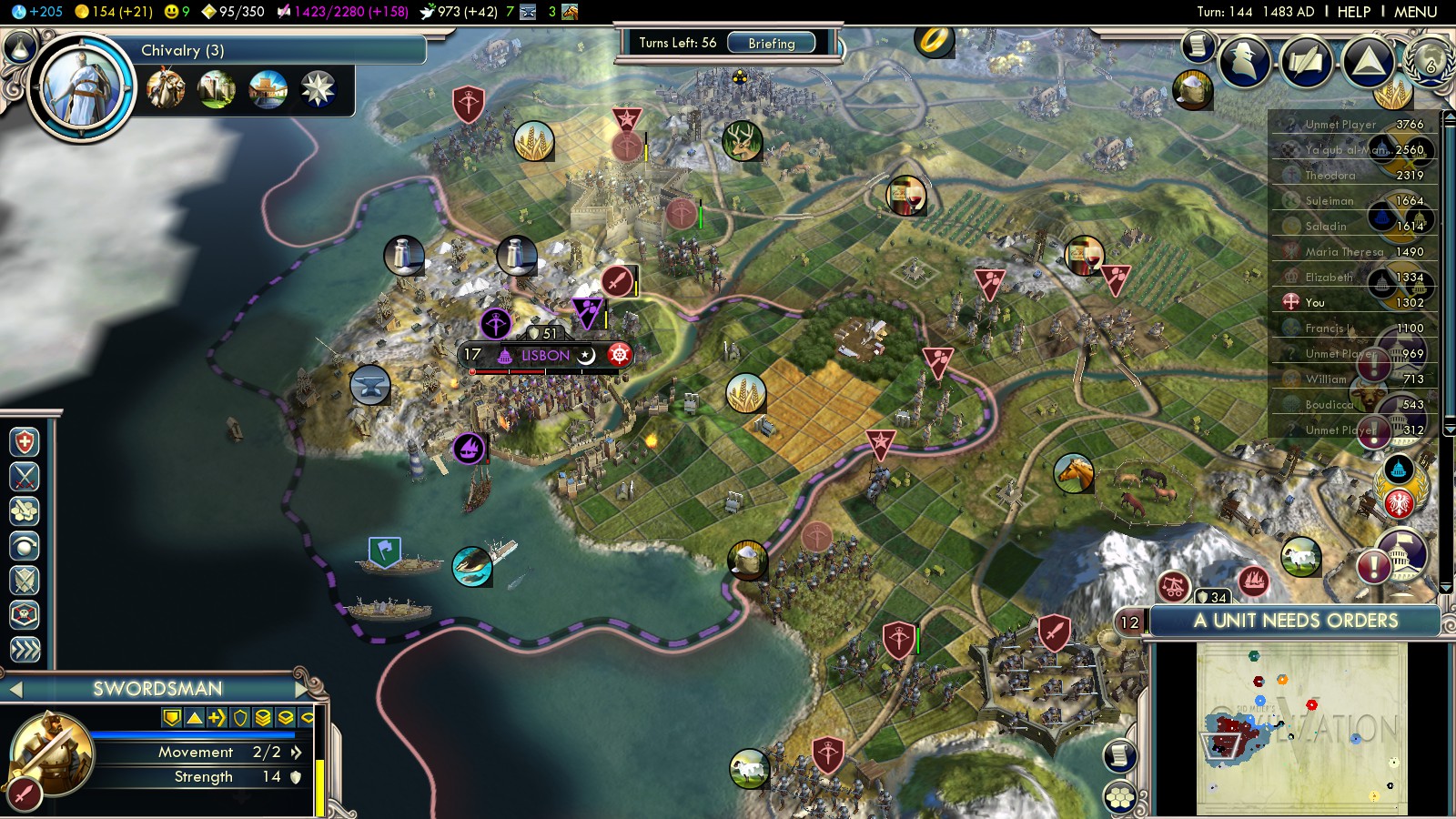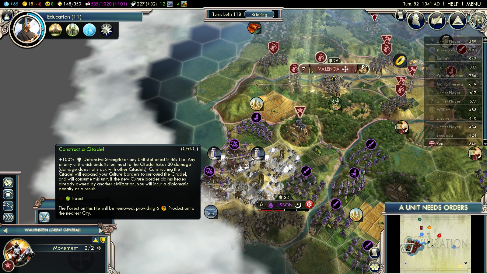 Going back some turns I was able to build some more units. Also I had built a citadel towards Lisbon, helping to defeat their massive army (compared to mine). Furthermore I bribed the Ayyubids against England.
