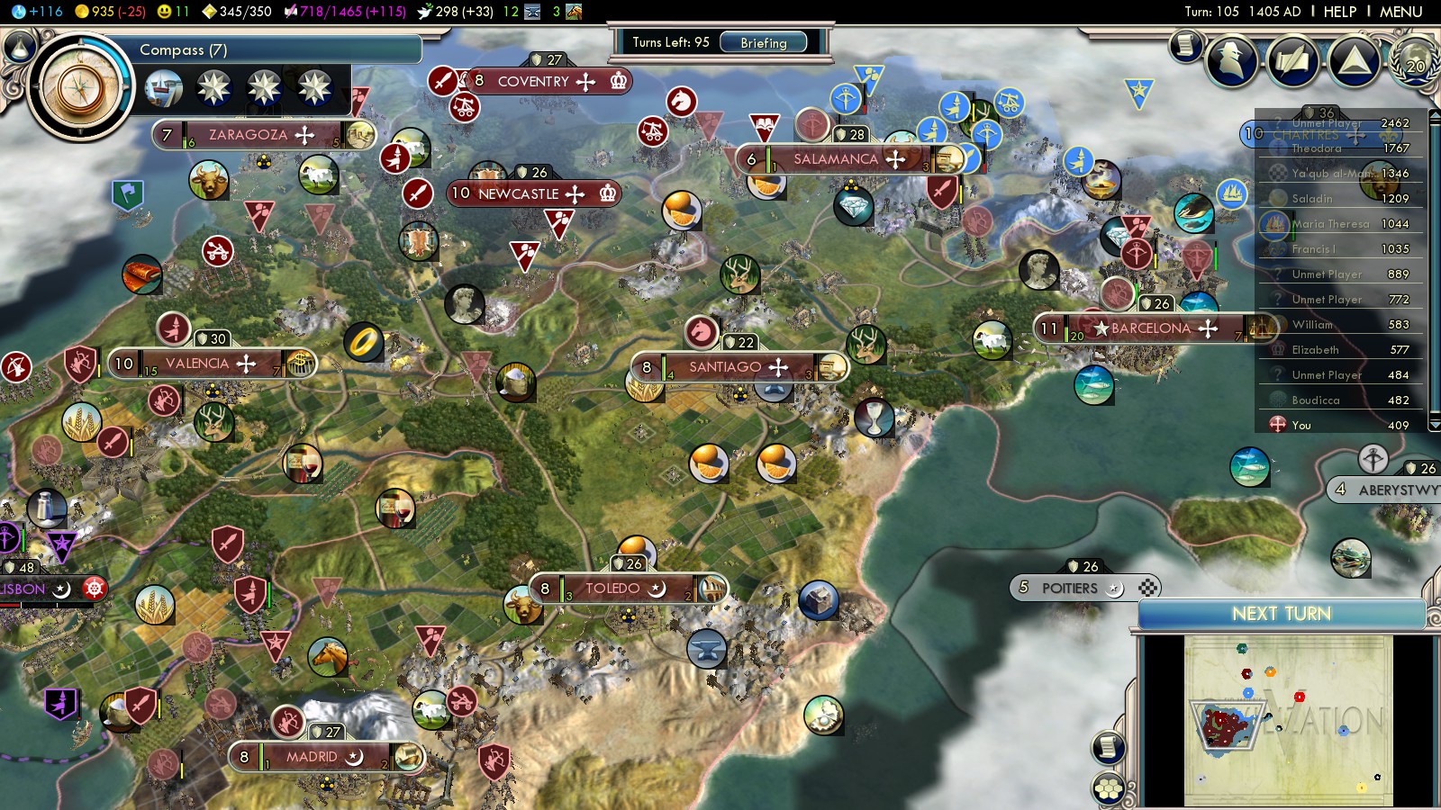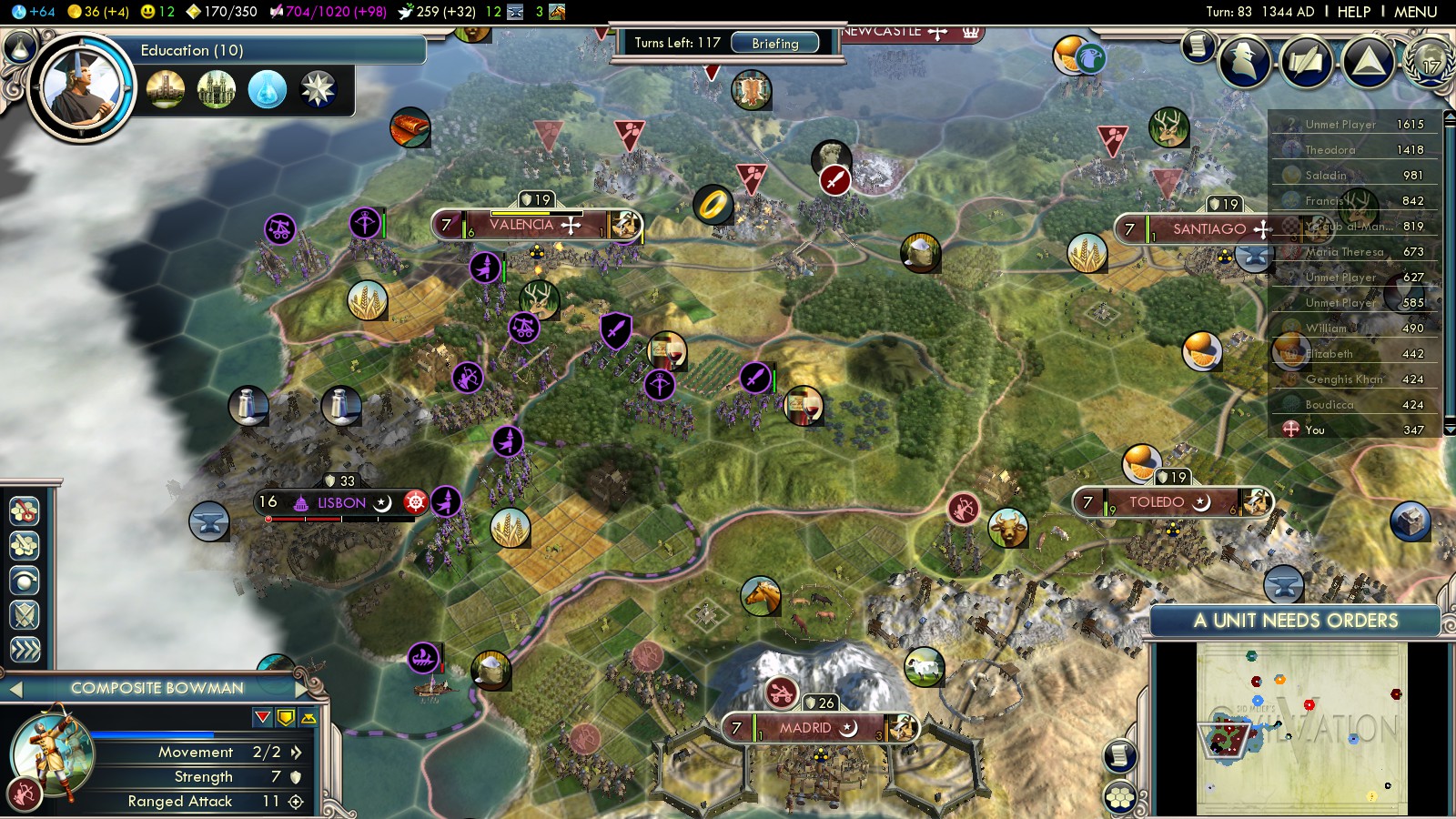 Following the above build order I already had a catapult in Madrid plus 9 Composite Bowmen. Also you can use some Faith to buy a pikeman or other melee. That’s enough to defend the Pyrenees against France (4 archers), defend Valencia against Lisbon (5) and be flexible enough to send some units South should the Almohads come for you. Around turn 100 Spain was going Into the Renaissance with big steps, standing strongly on Iberia. In turn 102 I even made peace with the Ayyubids for 3400 Gold (for me).