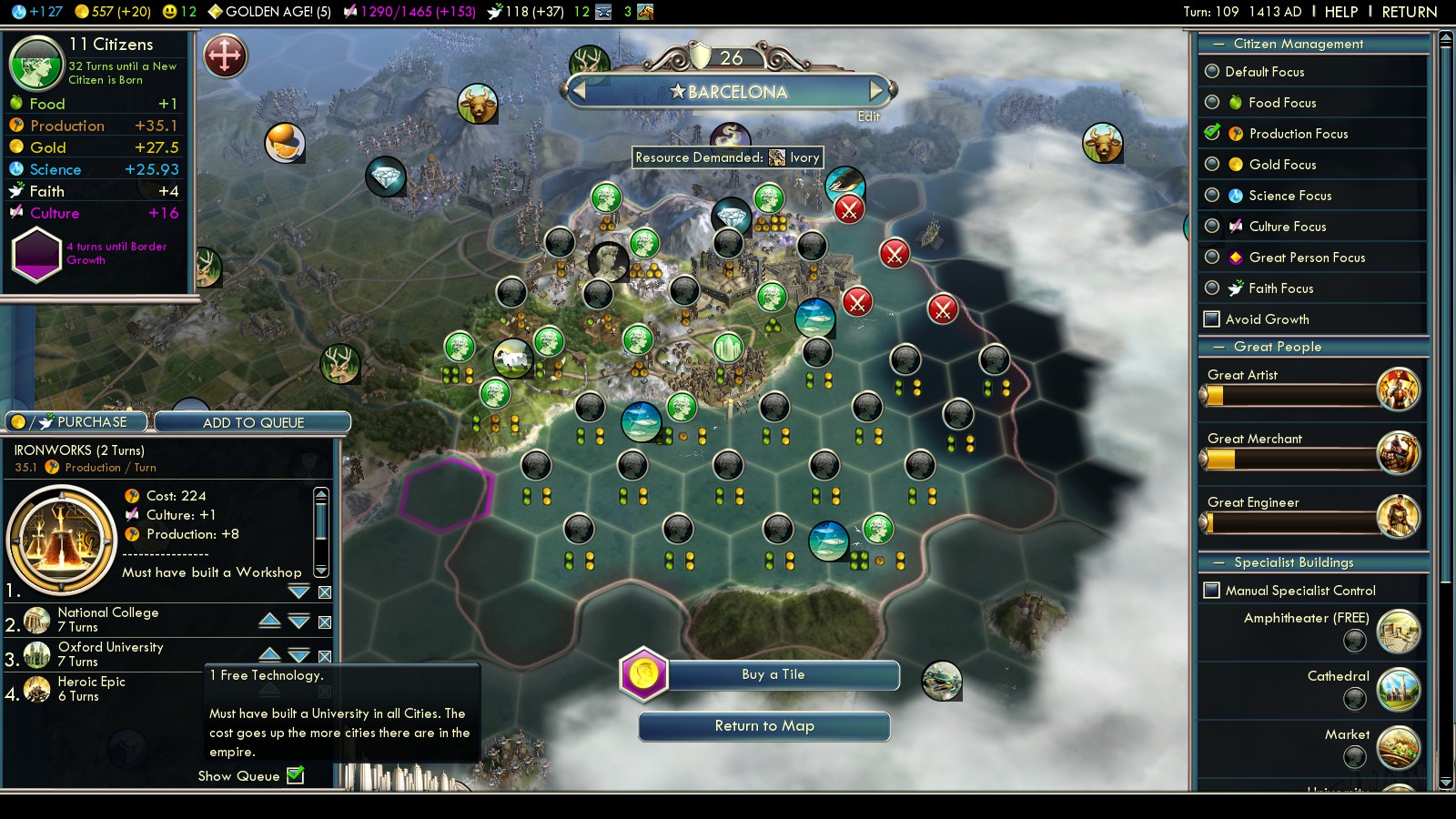 - Education (turn 92 – build Universities!)