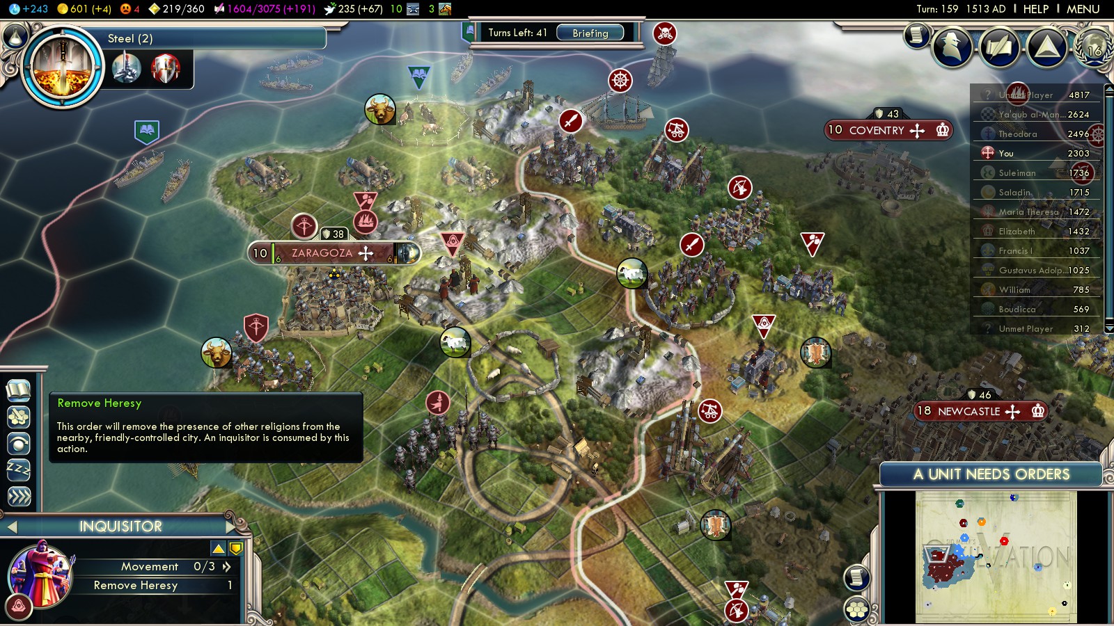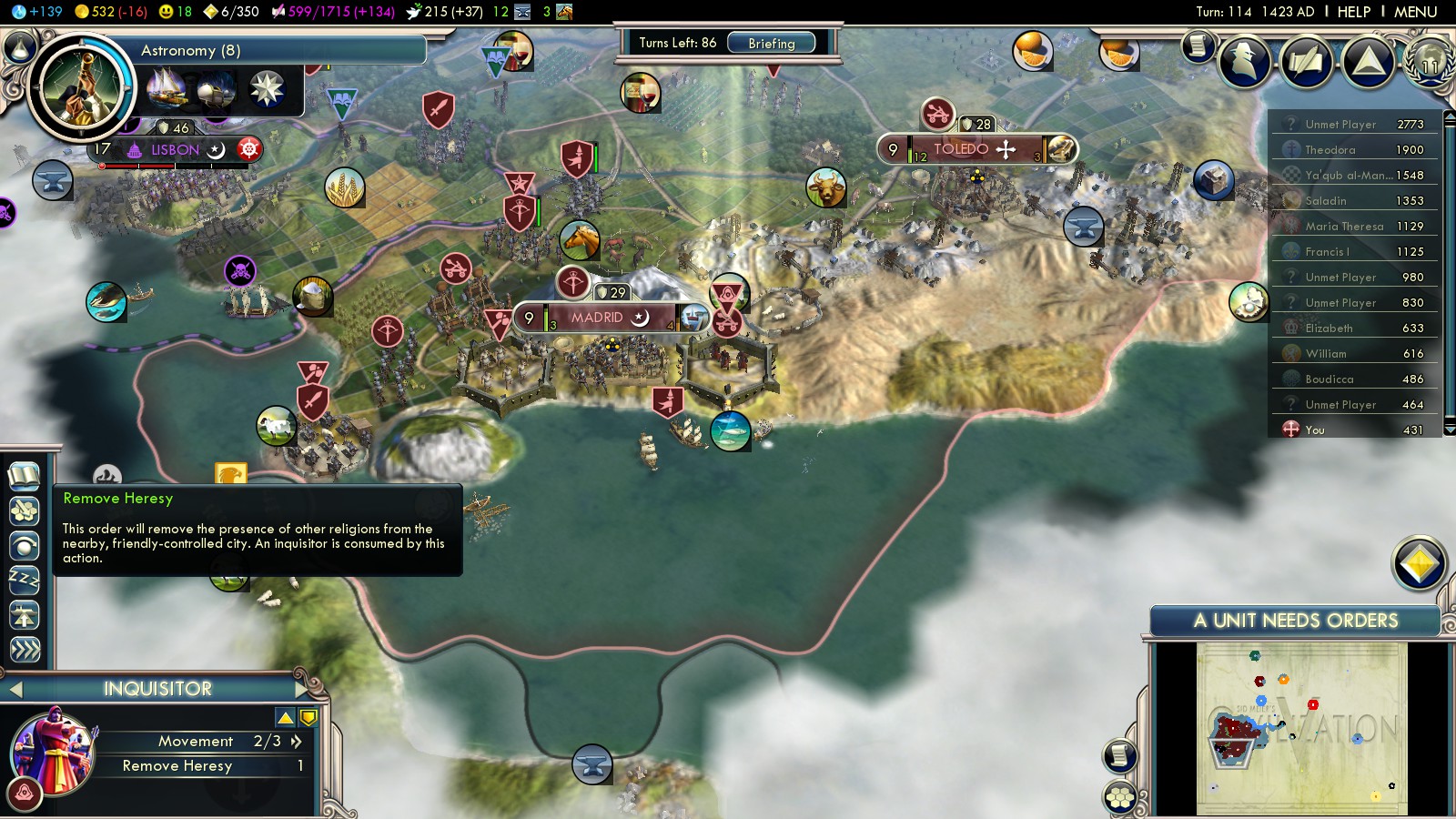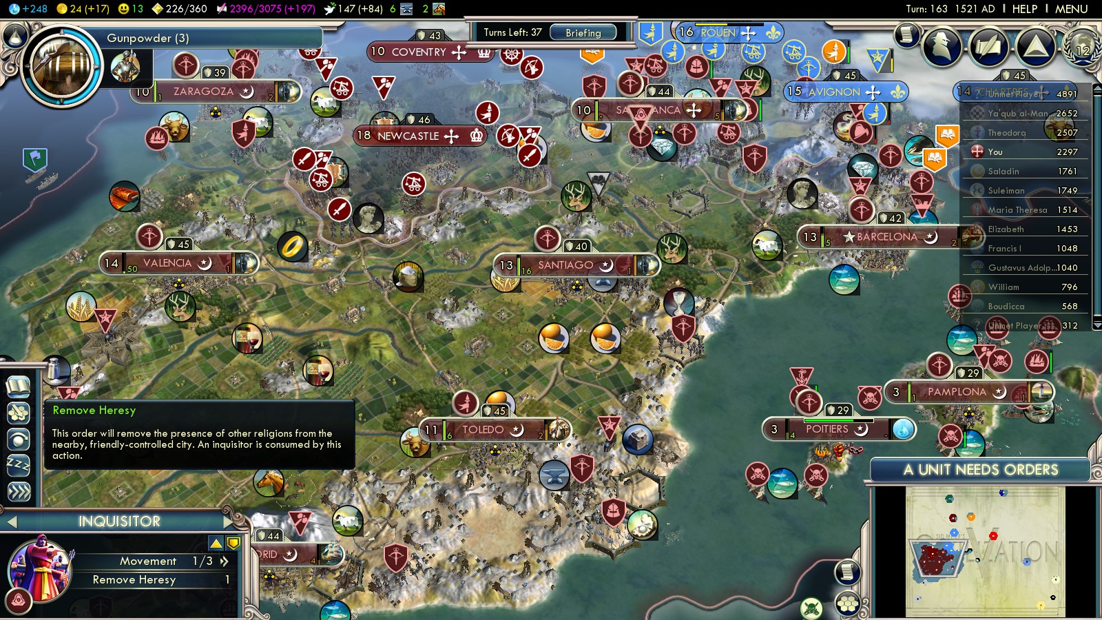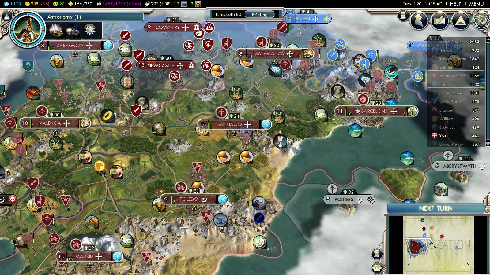 Playing Into the Renaissance as Spain there’s not many other civilizations to turn against for scoring VP. My initial plan was simply to convert to Islam and conquer Catholic Europe. It was the obvious thing to do whilst already being at war with France.
