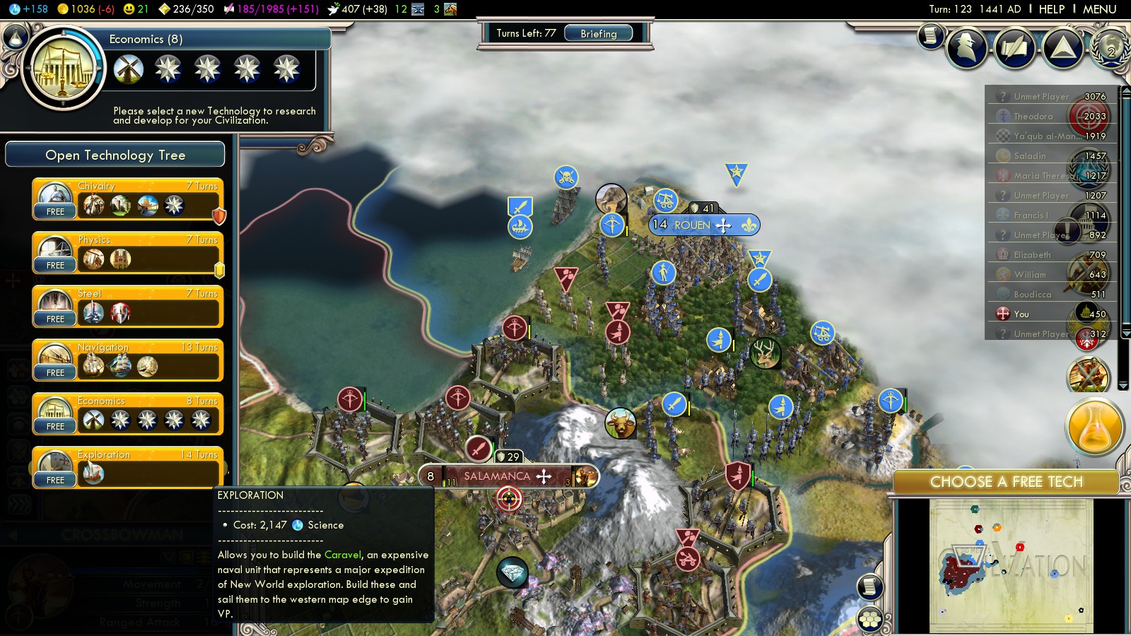 - Military Tradition – (turn 77) for +50% XP for all units, which you need early to grow a huge number of veterans.