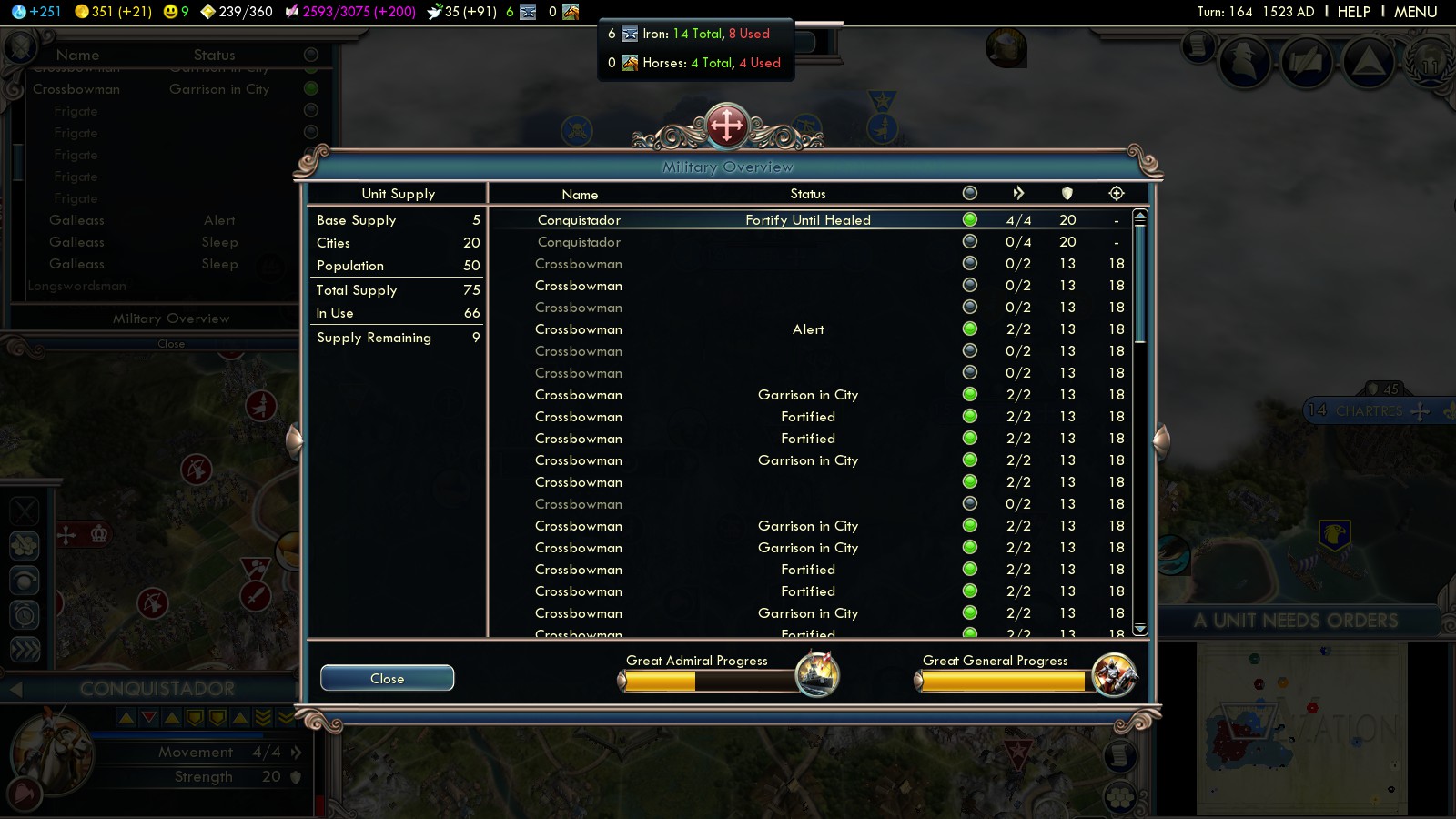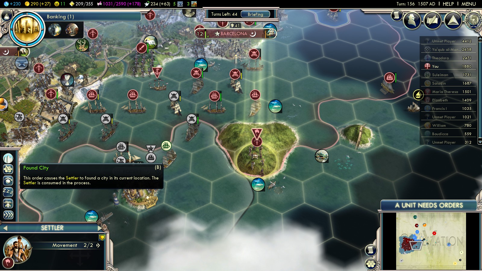 To secure my coastline and enlarge with control of the Mediterranean Sea, the Balearic islands had to be the first step. Around that time military supply became an issue. I didn’t want to keep too many unproductive cities, but still wanted to engulf those islands. A new city had to be founded.