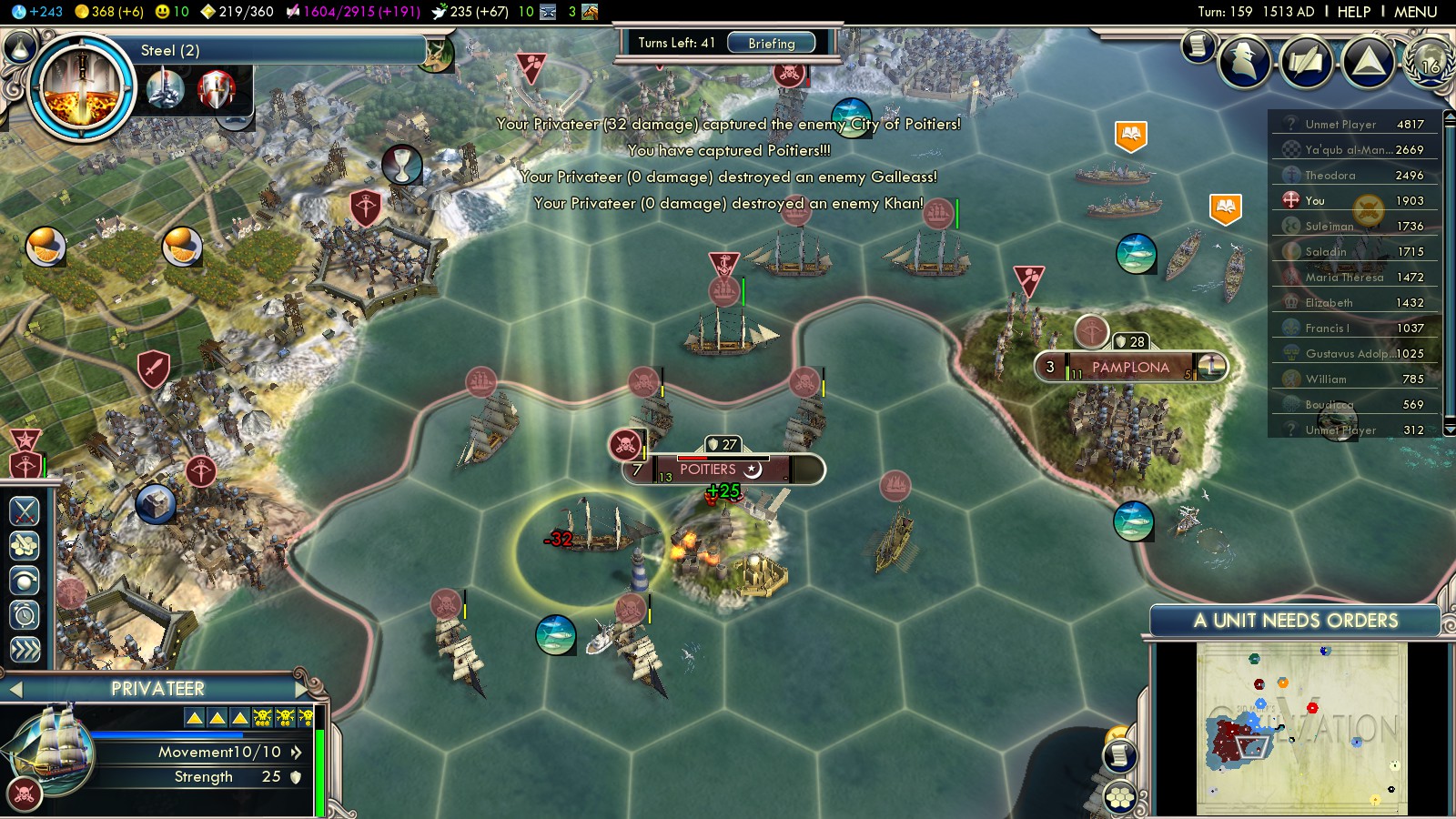 - Steel (turn 161, compared to 113 in my France game)