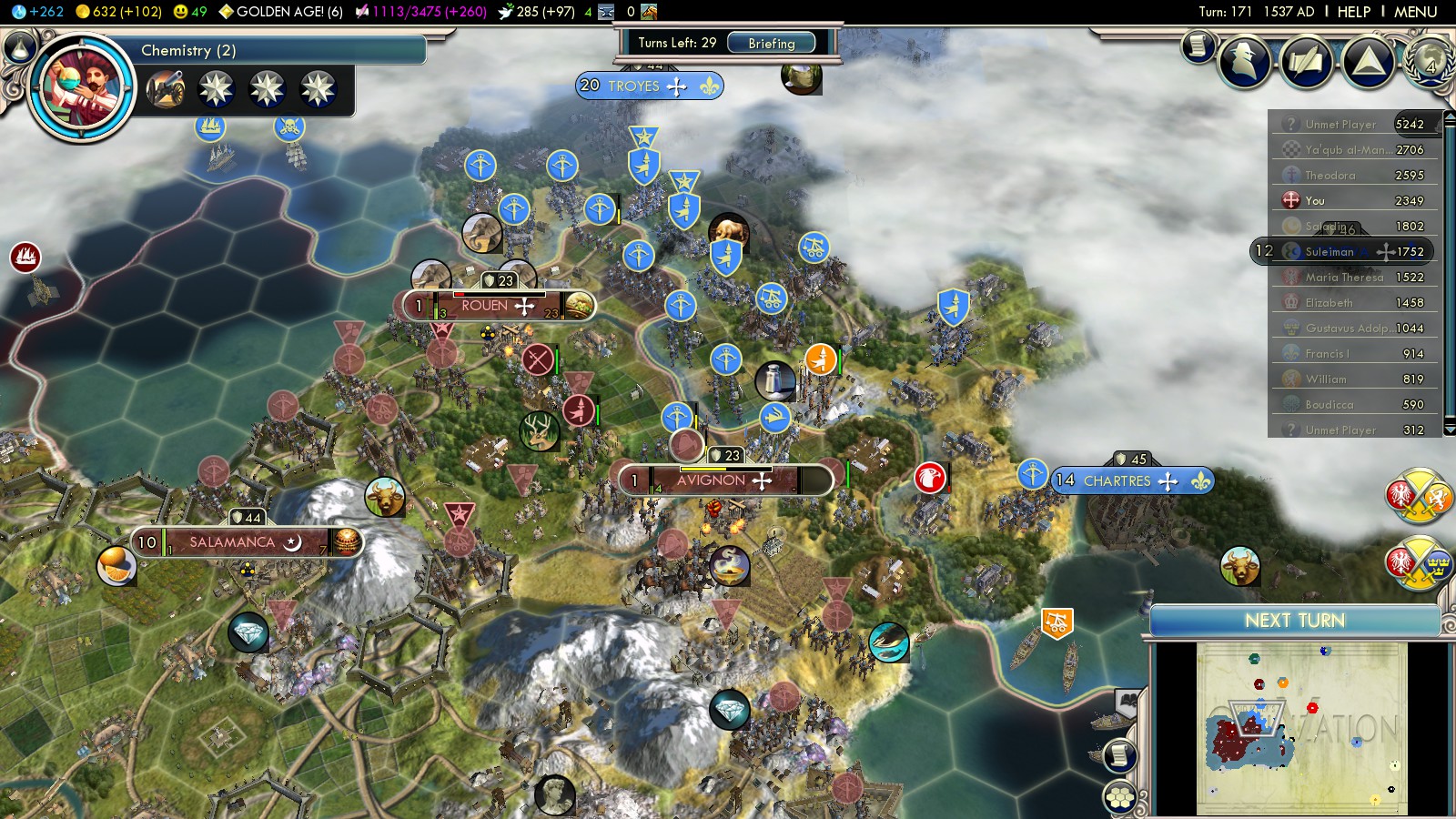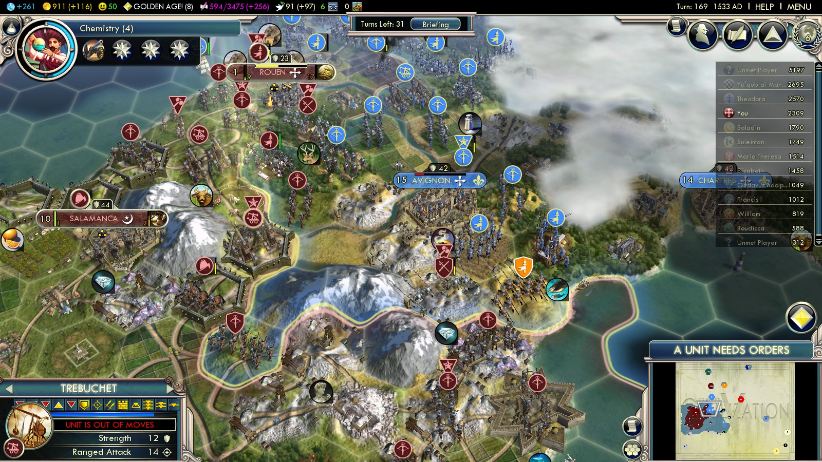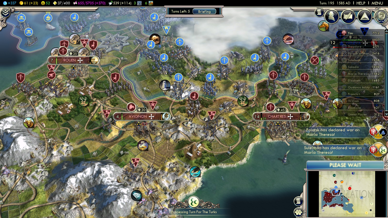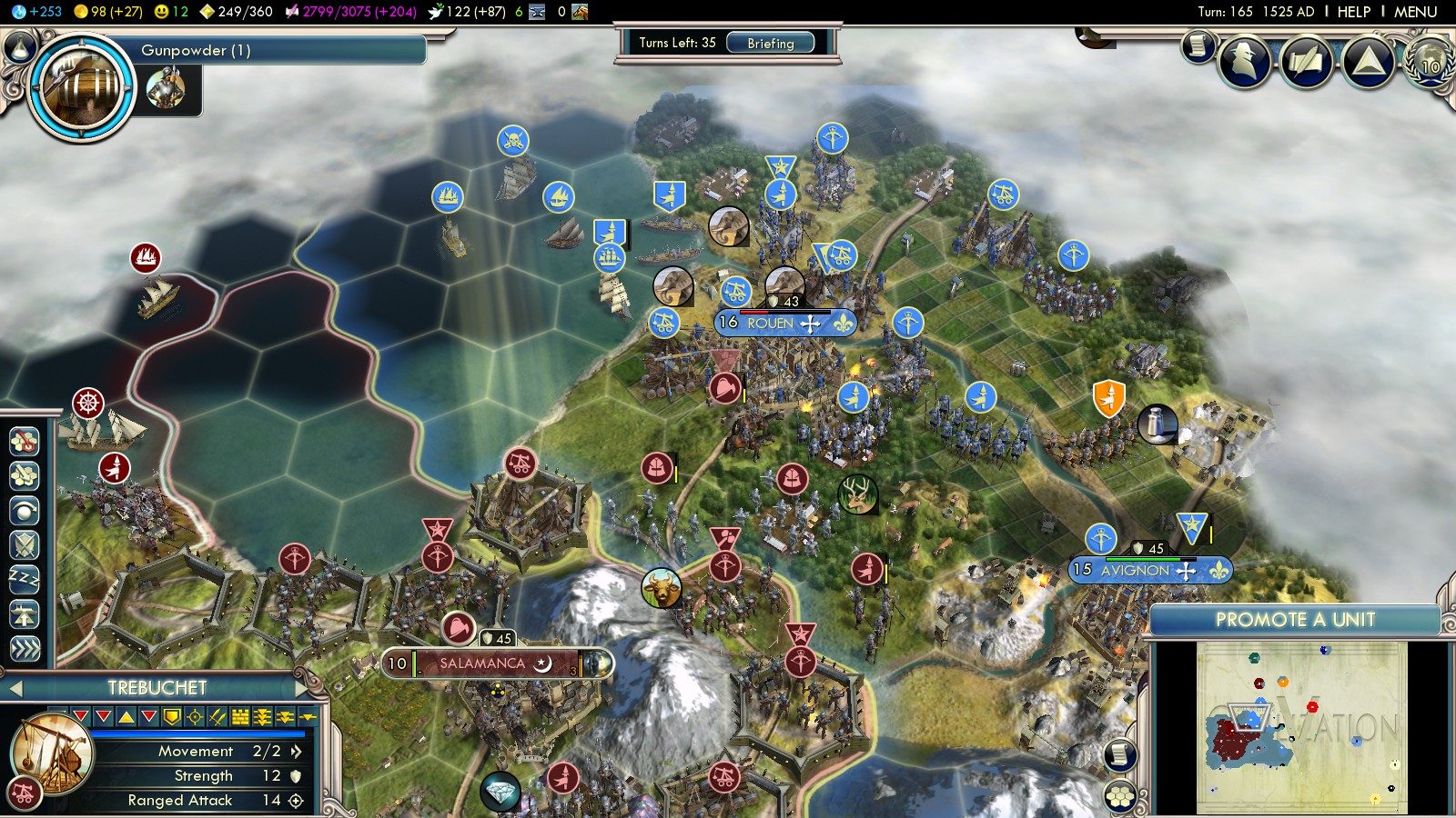 With various veterans of the Pyrenees being at war for hundreds of years, capturing French cities was only a matter of time. Elite Trebuchets and Crossbowmen fought back incoming French units and spare bombardments were directed at the cities of Rouen and Avignon. Unfortunately they were Catholic, thus granting no VP. Chartres was assigned to me in the following peace treaty. Although France amassed units at the border, this was end of the Spanish-French war in this game.