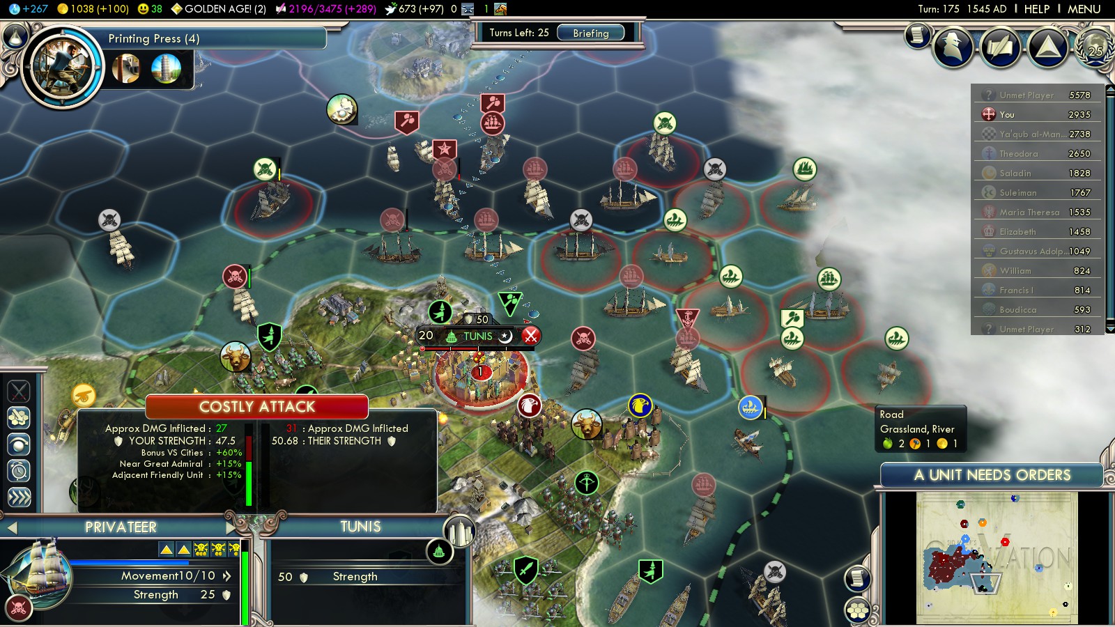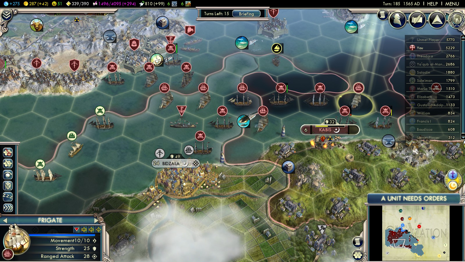 From then on diplomacy didn’t matter anymore. The rest was conquering every Almohad coastal city in Northern Africa. Starting from Tunis in the east and slowly advancing west. It’s important to as early as possible control the Strait of Gibraltar, so less Almohad ships can threaten you in the Mediterranean. Place your defending ship so only 1 enemy ship can attack per turn.