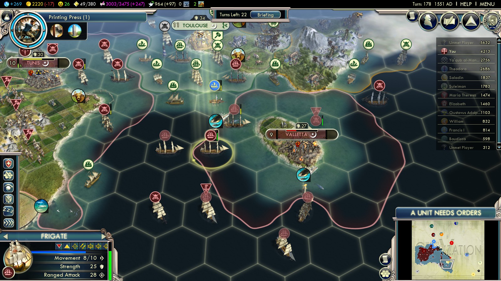 In turn 161 I could make peace with the Almohads. This bought some time to finish France in the Mediterranean and capture Tunis and Valetta. I wanted Valetta as small as possible as quickly as possible, because it was likely to fall, quickly again. It was directly in the way of any Turkish fleet sailing west. So I captured it for 450 VP, sold it to Byzantium, declared war on Byzantium and captured it again for 225 VP (because population size was only half).