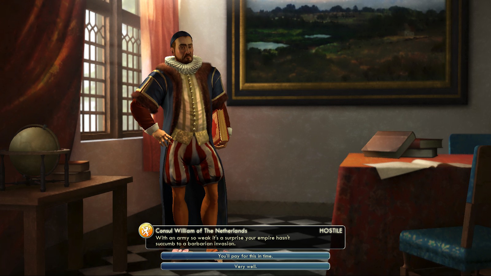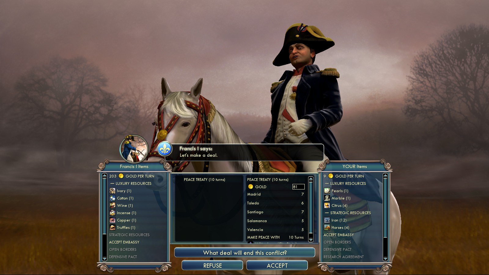 I had to declare war on France in turn 47 as to now allow them a settlement on my side of the Pyrenees. This war lasted centuries as in the beginning they didn’t want peace, while later, after the tides of battle had turned, I didn’t want peace! Just look at their initial peace offer: Ridiculous! I got my first spy in turn 66 and send him to Amsterdam. In the entire game I hadn’t been at war with the Netherlands at all.