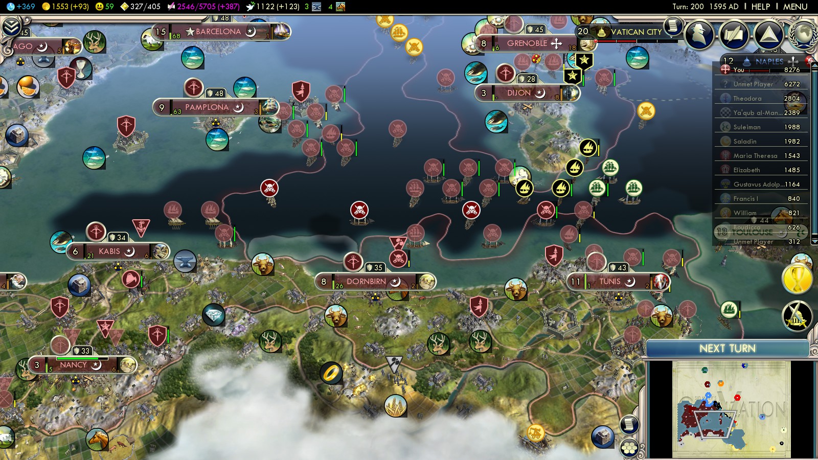 Dijon and Grenoble (from France) for now completed my conquest of Islands in the Mediterranean. Both cities granted no VP, as they were Catholic at the time.