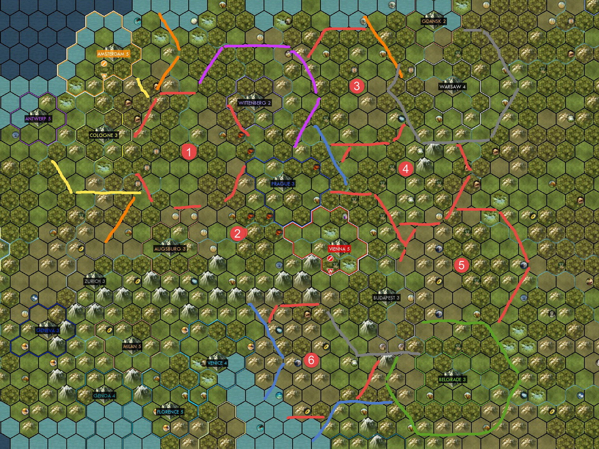 - Found Laibach (SW of Budapest) to secure resources and get a foot on the Balkans (turn 52)
