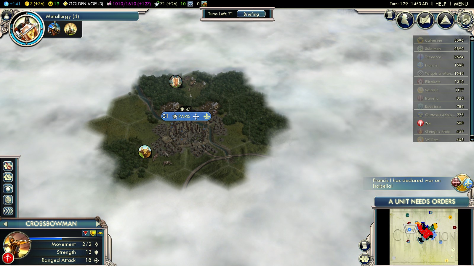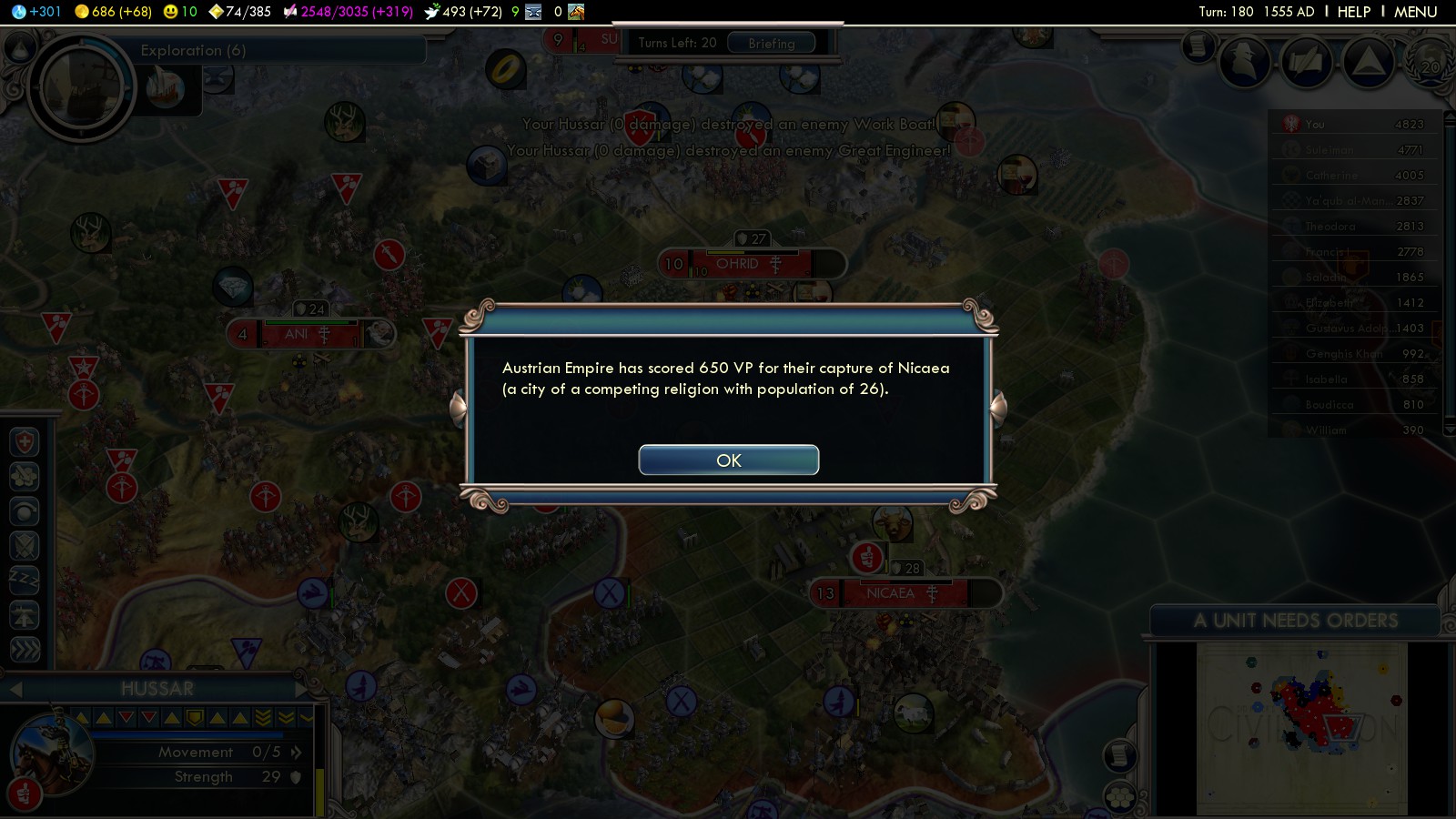 By now you’ll not only have a significant number of veteran Crossbowmen, but also some elite Hussars. Your offensive capabilities will allow you to win the game by conquering foreign religion cities.