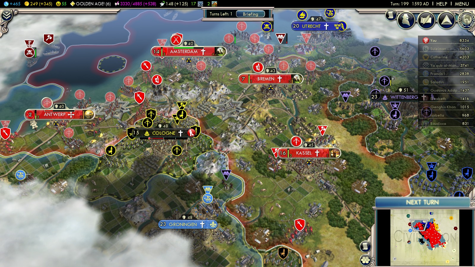 - Capture Antwerp (turn 191), waging war against England