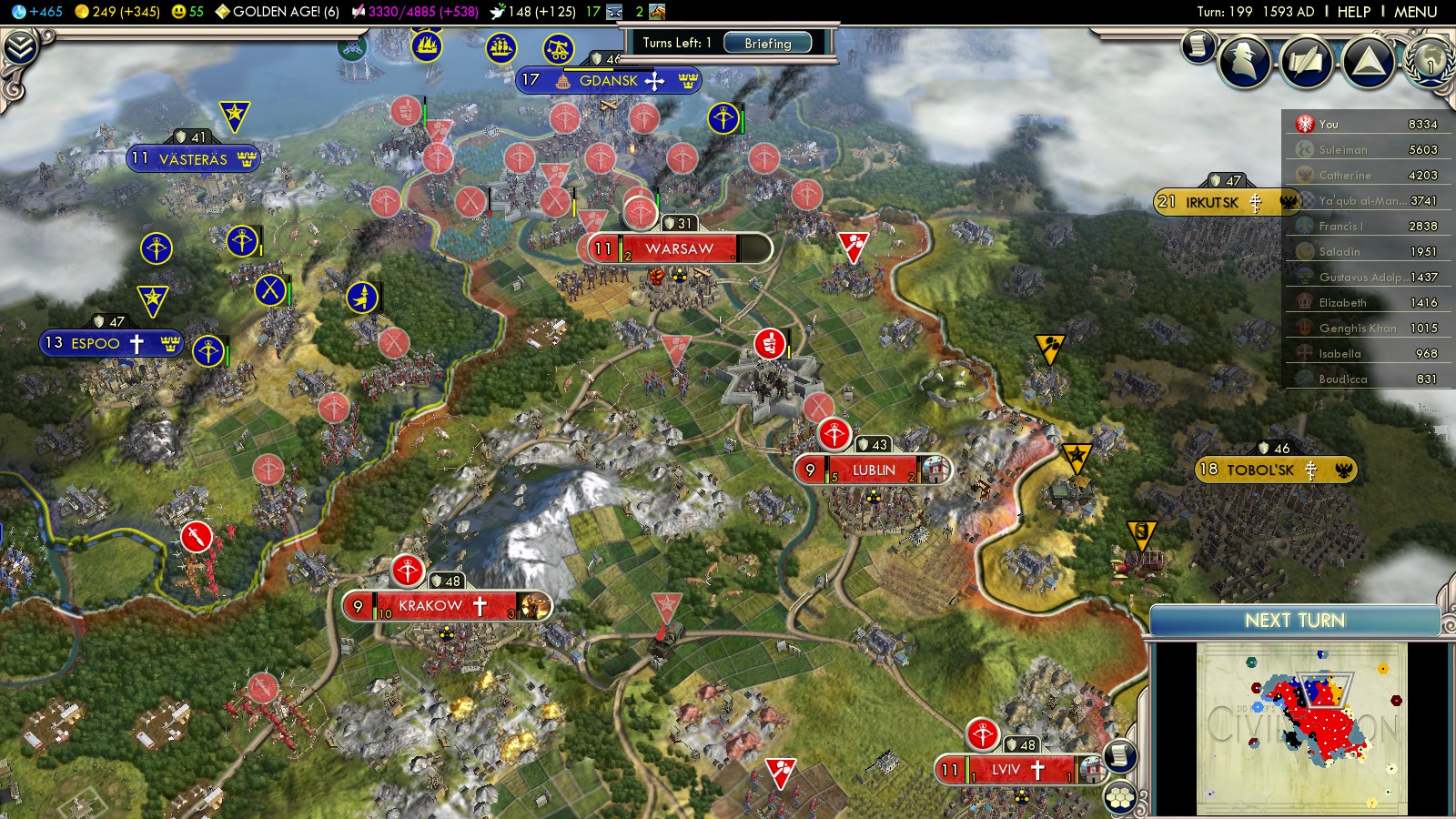- Warsaw had captured one Celtic city: I took Ramsey back (turn 160)