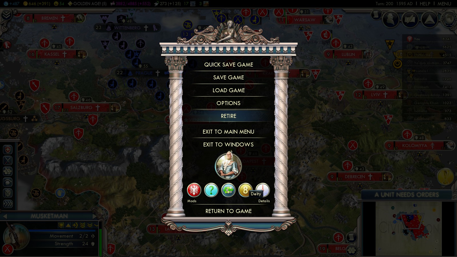 12:45 hours playing time said the “Messages” tab at the end of the game. Playing Austria was big big fun. Basically I chose Into the Renaissance Austria after doing all the Steam Achievements for this scenario. Normally Austria is one of the strongest contestants, dominating central Europe. Playing it myself was… Challenging, but doable. This game honed the skill of beating the scenario on Deity with all the other nations.