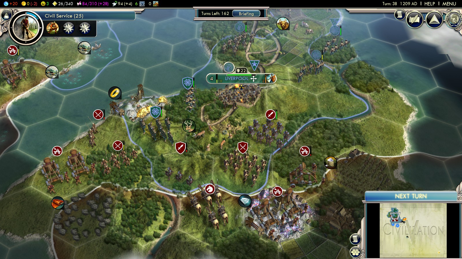 Liverpools position also helps a lot! There’s no place England can maneuver – you’re protected by hills to the SW and by forest, a river and grassland between it. You can fire all across the hills and the grassland, so no catapult should be able to fire (more than once) at your city. Unless your unit is at about 80HP (healing 20 each turn) always use promotions to heal in this state of the game.