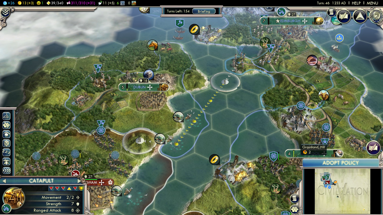 England declared war on me in turn 30. By then I had 4 cities, 2 Pictish Warriors and 1 Swordsman, 3 Composite Bowman (one of them bought with Faith – make use of your religion here!). That initial army will have a hard time defeating the English onslaught. But it worked. Remember: Always keep your melees garrisoned (and healing!) and shoot catapults first! Usually one melee attack (the first with a fresh unit) brings a catapult down to 30% HP. Finish it with one city bombardment and a bowman.