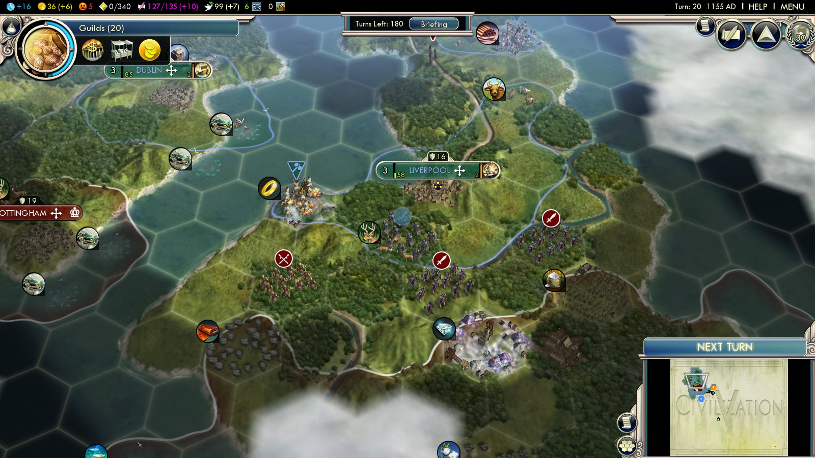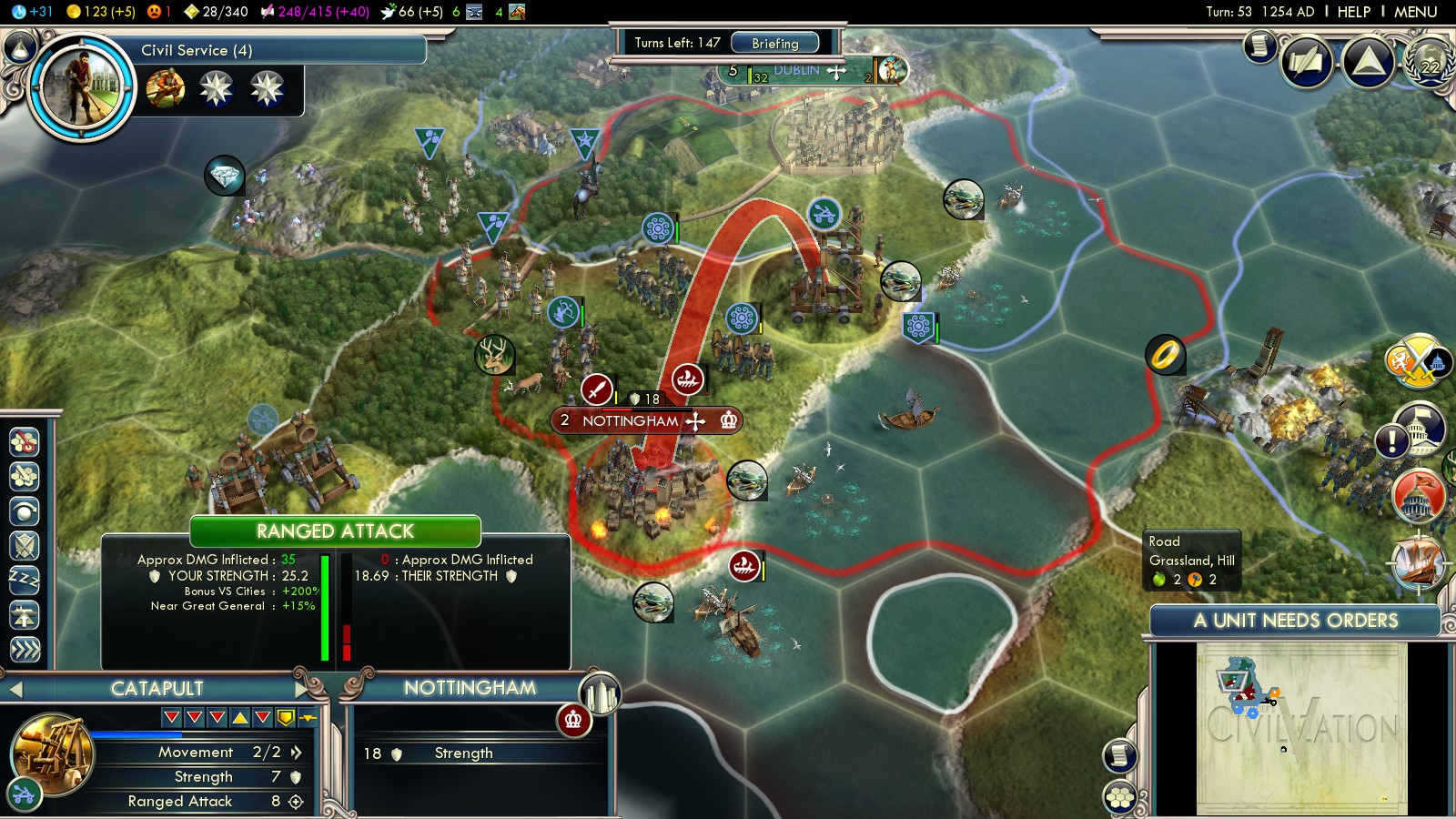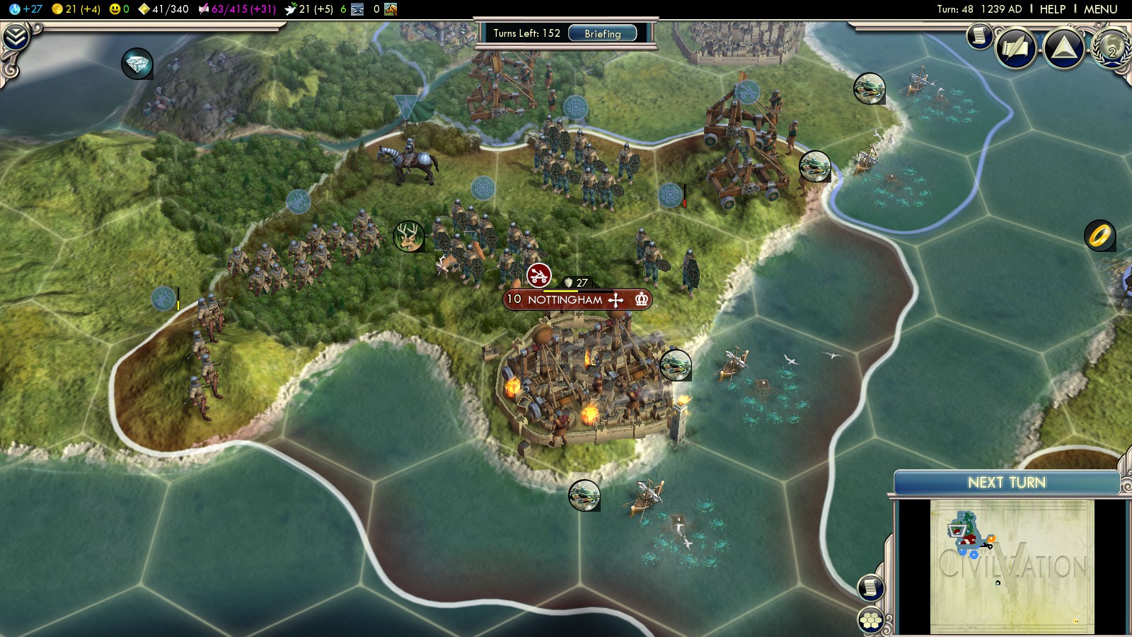 Most likely England will have built a city on Ireland as well. Go for that city first. You can’t afford units landing in your back, while marching into South England. Strategically well placed roads can help bringing units from Edinburgh to the Irish battlefield in only 2 turns. This is essential, since you’ll lose a unit every 2 turns and it needs to be replaced! I razed Nottingham (turn 51-53), because its position would have allowed one more city at the west coast of Ireland. In fact England even sent a Settler there while I besieged Nottingham. Bottom line you don’t want more than 2 cities on Ireland, to not drain your economy.