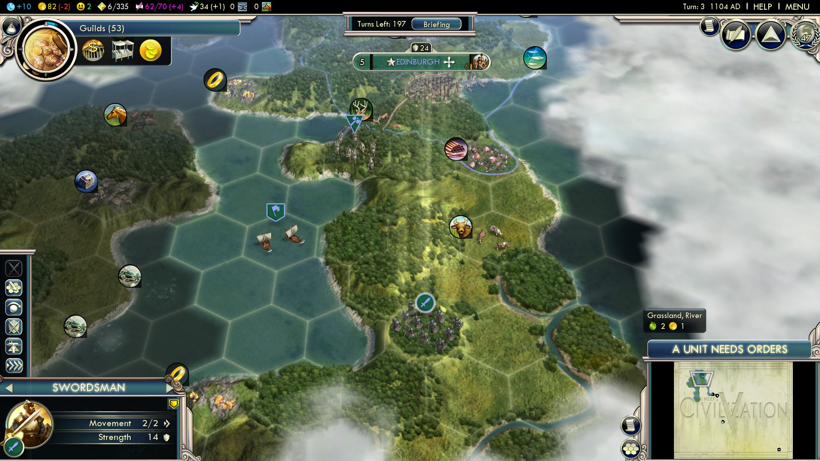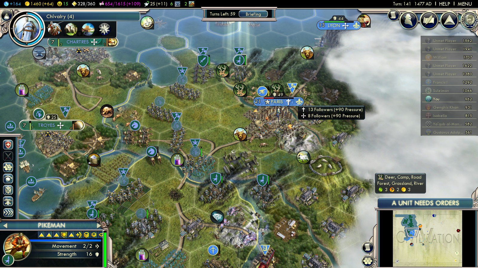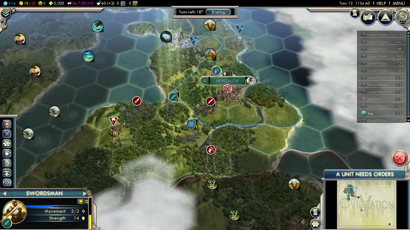 Here’s the short history of my 2 Deity attempts: To weaken England early, before they can amass loads of units, I founded Newcastle and declared war on England in turn 10 already. Fighting off the initial attack (they already start with several Swordsmen and three (!!!) catapults), I garrisoned the forest hills in middle England. Not killing enough units, they overwhelmed me in turn 40.
